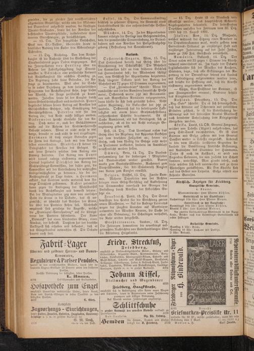 Airchlich. Anzeigen für Friedberg. Evangelische Gemeinde. 4. Advent. 1 Pfarramtswoche: Herr Pfarrer Köhler. 5 Gottesdienst in der Stadtkirche: Nachmittags 1½ Uhr: Herr Pfarrer Meyer. ö Gottesdienst in der Burgkirche: Vormittags 9½ Uhr: Herr Pfarrer Köhler. Abends 5 Uhr: Herr Candidat Medert. Am zweiten Weihnachtstage Abendmahl in der Burg⸗ kirche, Beichte nach dem Vormittags-Gottesdienste des ersten Festtages.