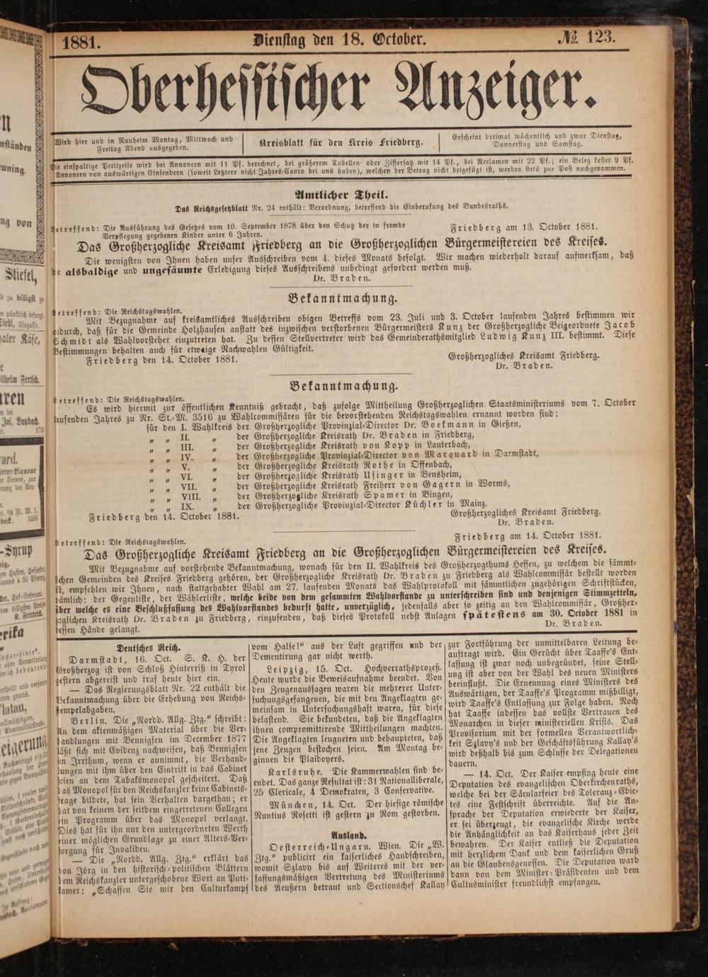 Dr. Braden. Friedberg am 14. October 1881. Bürgermeistereien des Kreises.