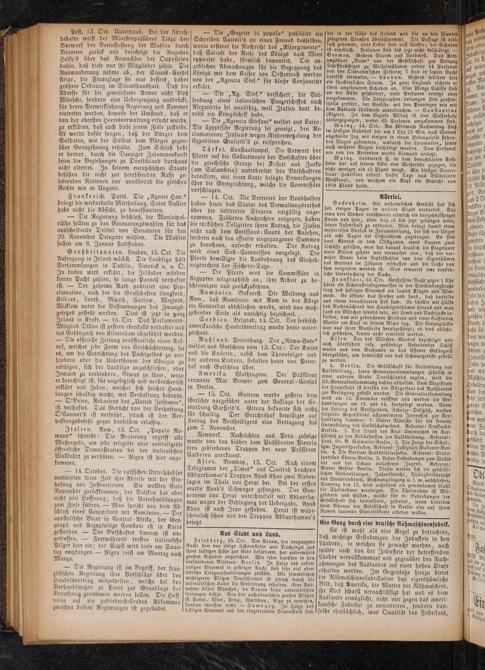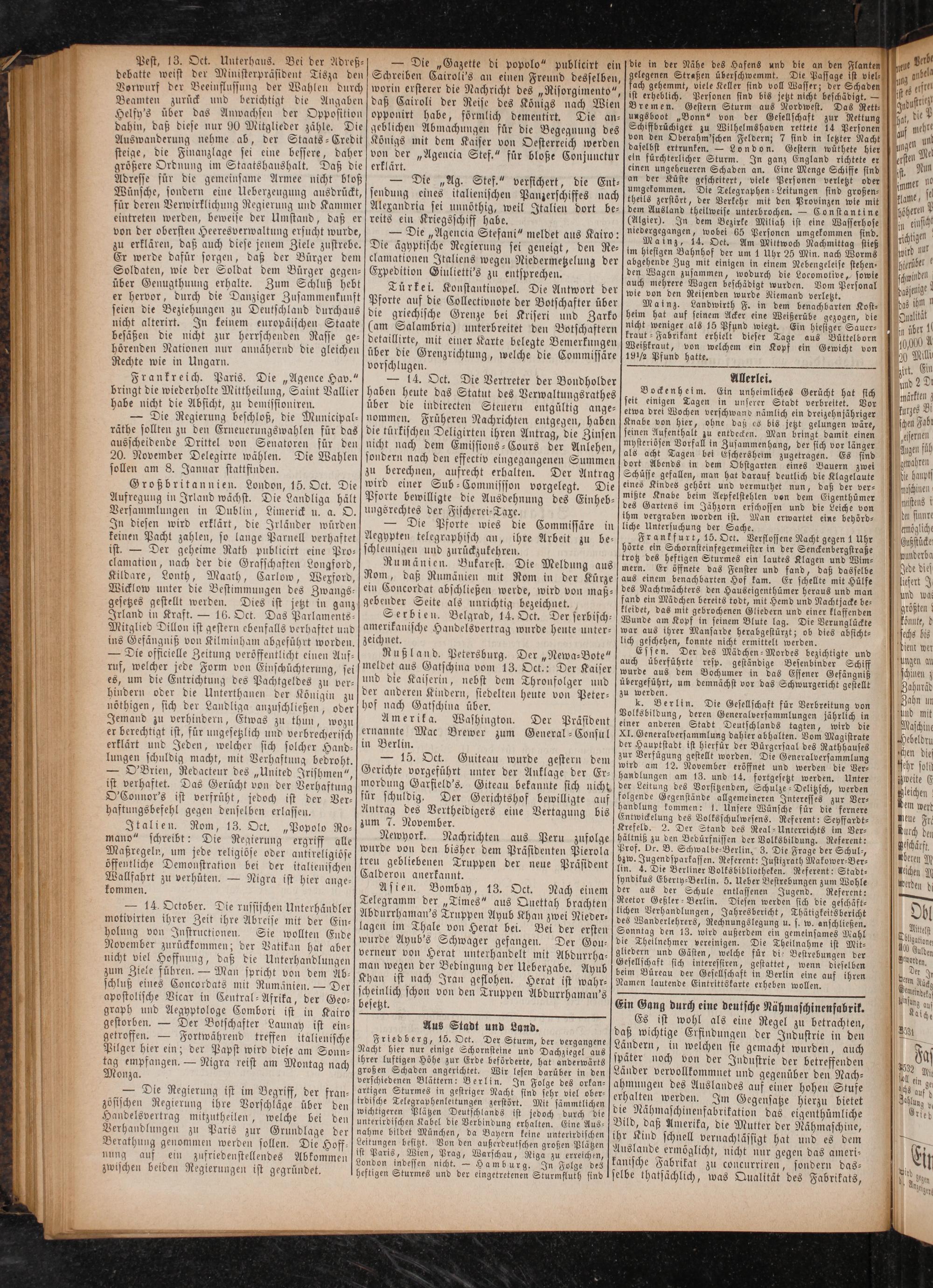 Friedberg, 15. Oet. Der Sturm, der vergangene Nacht hier nur einige Schornsteine und Dachziegel aus ihrer luftigen Höhe zur Erde beförderte, hat anderwärts großen Schaden angerichtet. Wir lesen darüber in den verschiedenen Blättern: Berlin. In Folge des orkan⸗ artigen Sturmes in gestriger Nacht sind sehr viel ober— irdische Telegraphenleitungen zerstört. Mit sämmtlichen wichtigeren Plätzen Deutschlands ist jedoch durch die unterirdischen Kabel die Verbindung erhalten. Eine Aus— nahme bildet München, da Bayern keine unterirdischen Leitungen besitzt. Von den außerdeutschen großen Plätzen ist Paris, Wien, Prag, Warschau, Riga zu erreichen,