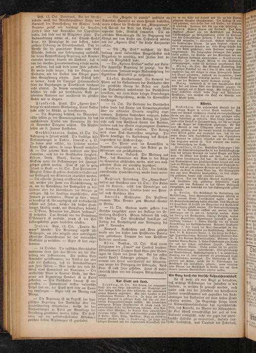 Rußland. Petersburg. Der„Newa-Bote“ meldet aus Gatschina vom 13. Oct.: Der Kaiser und die Kaiserin, nebst dem Thronfolger und der anderen Kindern, siedelten heute von Peter— hof nach Gatschina über.