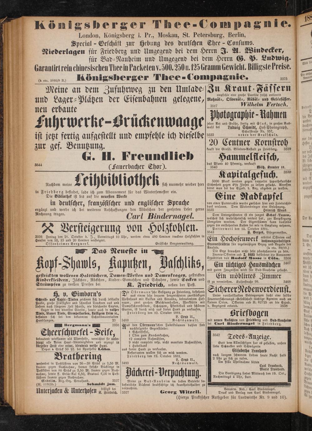 von einer Patentachse wurde zwischen ap und Friedrichs⸗ dorf verloren. Dem Wiederbringer eine Belohnung. 3535 Heinrich Waas. Dem Unterzeichneten ist ein junges Schaf-Lamm, welches sich wahrscheinlich verirrt hat, zur Verpflegung übergeben worden. Der Eigenthümer kann dasselbe gegen die entstehenden Kosten bei mir in Empfang nehmen. Petterweil den 14. Oetober 1881. 3543 F. Berges, Bürgermeister.