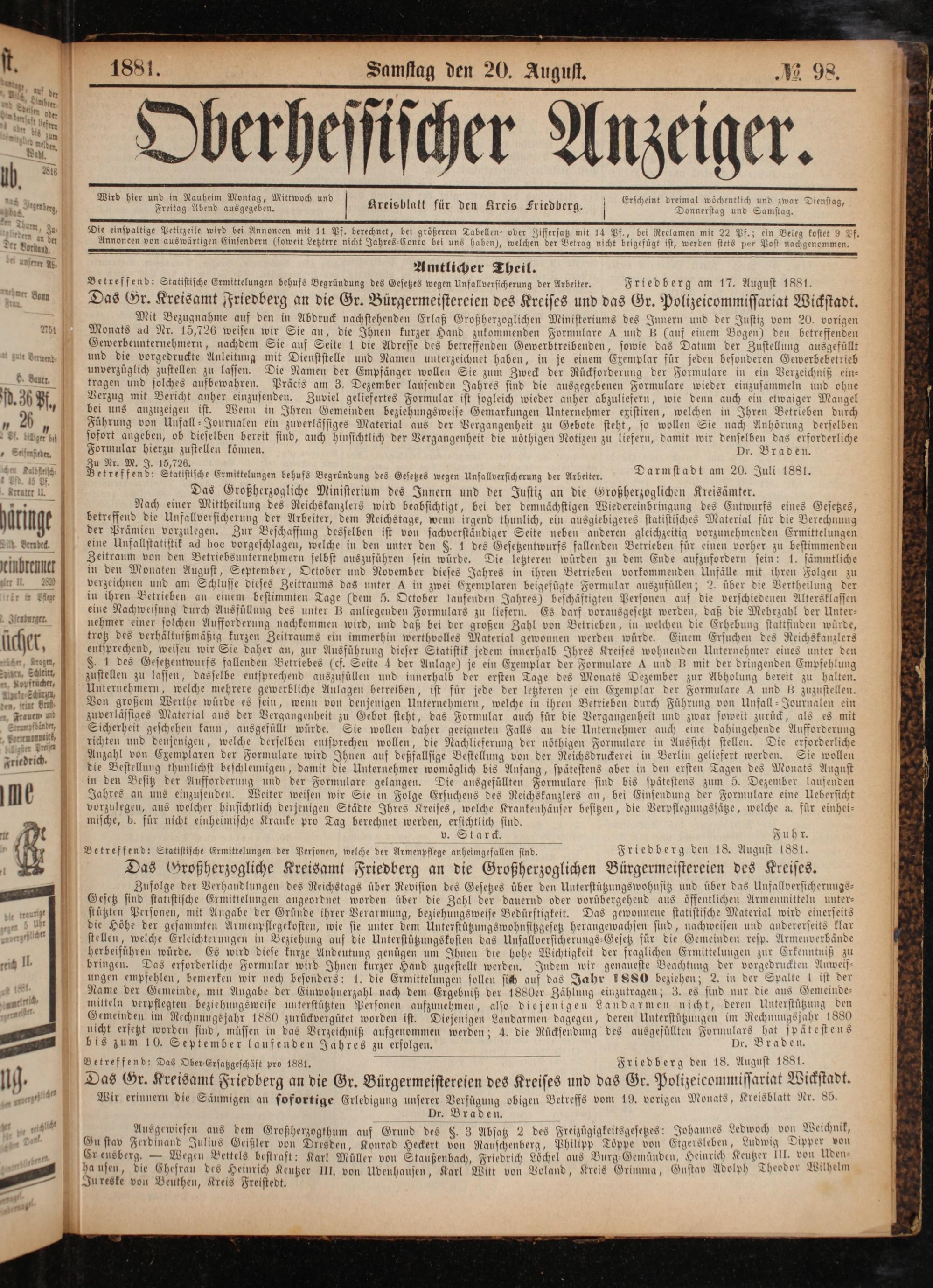 Amtlicher Theil. Betreffend: Statistische Ermittelungen behufs Begründung des Gesetzes wegen Unfallversicherung der Arbeiter. Friedber g am 17. August 1881.