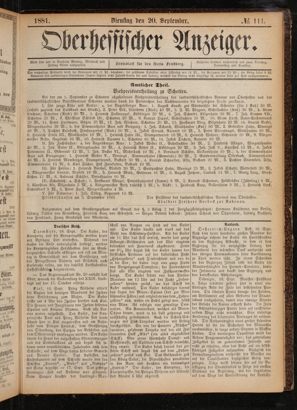 Bei der am 1. September zu Schotten abgehaltenen Viehpreisvertheilung des landwirthschaftlichen Vereins von Oberhessen und des landwirthschaftlichen Bezirksvereins Schotten wurden durch die Preisrichter den Nachbenannten die beigesetzten Preise zuerkannt.