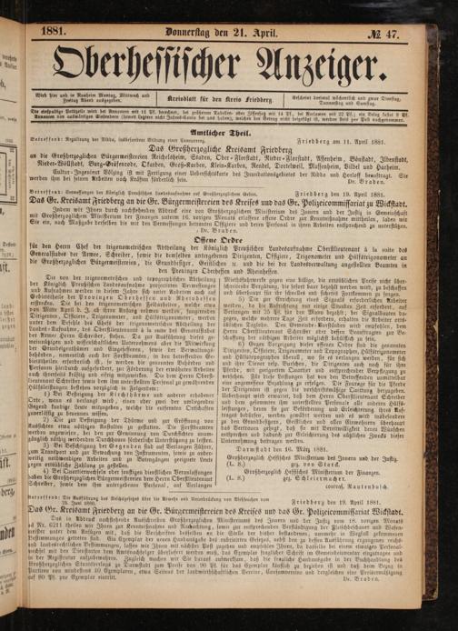 Darmstadt den 16. März 1881. Großherzoglich Hessisches Ministerium des Innern und der Justiz.