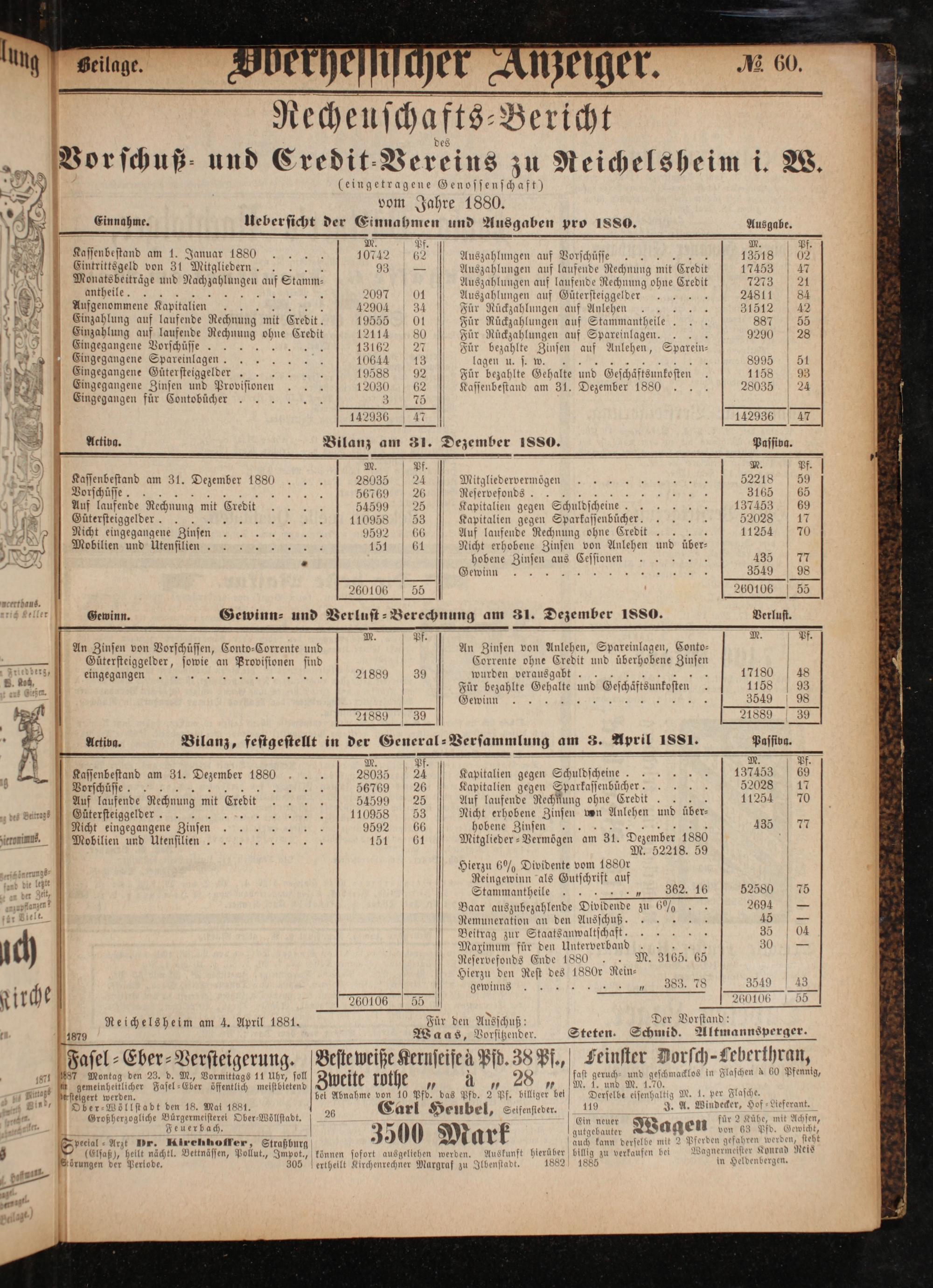 Uebersicht der Einnahmen und Ausgaben pro 1880. Ausgabe. M. Pf. M. Pf. dassenbesend am 1. Januar 1880 10742 62 Auszahlungen auf Vorschüsse 13518 02 A Eintrittsgeld von 31 Mitgliedern. N Auszahlungen auf laufende Rechnung mit Credit 17453 47 5 A ö Monatsbeiträge und been 11555 Stamm⸗ Auszahlungen auf laufende Rechnung ohne Credit i r antheile. 2097 01 Auszahlungen auf Gütersteiggelder 2481184 1 85 0 Aufgenommene Kapitalien 42904 34 Für Rückzahlungen auf Anlehen 5 31512 13 184 Einzahlung auf laufende Rechnung mit Credit. 19555 01 Für Rückzahlungen auf Stammantheile 887 55 8 Einzahlung auf laufende Rechnung ohne Credit 12114 80 Für Rückzahlungen auf Spareinlagen. 9290 28 E19 Eingegangene Vorschüsse 5 iD Für bezahlte Zinsen auf Anlehen, Sparein— eingegangene Spareinlagen. 10644 13 lagen u. s. w. 8995 51 2 NI Eingegangene Gütersteiggelder. 19588 92 Für bezahlte Gehalte 5 Geschäftsunkosten 1158 93 1 Eingegangene Zinsen und Provisionen 12030 62 Kassenbestand am 31. Dezember 1880 28035 24 1 Eingegangen für Contobücher 3 75 . 3 142030 17 14290360 17 D Activa. Bilanz am 31. Dezember 1880. Passiva. 0 M. Pf. M. Pf. 5 Kassenbestand am 31. Dezember 1880 28035 24 Mitgliedervermögen 52218 5 Vorschüsse 5 56769 26 Reservefonds. g 3165 65 0 N Auf laufende Rechnung mit Credit 54599 25 Kapitalien gegen Sch huldscheine 5 137453 69 757 Gütersteiggelder.. 110958 53 Kapitalien gegen Sparka ssenbücher. 52028 17 . Nicht eingegangene Zinsen ee 9592 66 Auf laufende Rechnung ohne Credit 5 1125470 6 28. Mobilien und Wensisenn: 15161 Nicht erhobene Zinsen von Anlehen und über— 5 s ö 4 hobene Zinsen aus Cessionen 435 77 Gewinn N 3549 98 260106 55 260106 55 nertthaus. r Gewinn. Sewiun⸗ und Verlust⸗ Berechnung am 31. Dezember 1880. Verlust. — — 77 W. 5 M. Pf. An Zinsen von Verschüssen, Conto⸗Corrente und An Zinsen von Anlehen, Spareinlagen, Conto— — Gütersteiggelder, sowie an Provisionen sind Corrente ohne Credit und überhobene Zinsen 1 D 21889 39 wurden 8 17180 48 * 3 Für bezahlte Gehalte und Gescostsurteften 1158 93 8 2 0 Gewinn„ 4 354998 75 ö JIS 39 21889 39 0 » 8 g Activa. Bilanz, festgestellt in der al Versammlung am 3. April 18 Passiva. N ö 1 5 M. Pf. 1„NM. Pf. 192208 Kassenbestand am 31. Dezember 1880 28035 24 Kapitalien gegen Schuldscheine 137453 69 5 ö Vorschüsse a 56769 26 Kapitalien gegen Sparkassenbücher. 52028 17 N Auf laufende Rechnung mit Credit 54599 25 Auf laufende Rechfung ohne Credit. 11254 70 des Betzs Scherselsgelder. 3 5 11095853 Nicht erhobene Zinsen von Anlehen und über— 3 Nicht eingegangene Zinsen 9592 66 hobene Zinsen 435 77 ernimns. Mobilien und Utensilien. 151 61 Mitglieder-Vermögen am 31. Dezember 1880 M. 52218. 59 3 Hierzu 6% Dividente vom 1880r ech ane 1 Reingewinn als Gutschrift auf in gat, Stammantheile„ 362. 16 52580 75 Aelanzen?[Baar auszubezahlende Dividende zu 6% 2694—. 1 8 Remuneration an den Ausschu ß. 45— [[Beitrag zur Staatsanwaltschaft. 95 d[Maximum für den Unterverband N 30. Ae Ende 1880. M. 3165. 65 [Hierzu den Rest des 1880r Rein— 7575 1 4 rt 3549 4 Kirche 260106 55 260106 3 ö Reichelsheim am 4. April 1881. Für den Ausschuß: Der Vorstand: t 1679 g g 5 Waas, ande Steten. Schmid. Altmannsperger. * 5 1* 0 2 2 8 Fasel⸗Eber⸗Versteigerung. Beste weiße Keruseife n Pfd. 38 Pf., Feinster Vorsch- Leberthr an, 4 57 ontag den 23. d. M., Vormittags 11 Uhr, sol 5 0 fast geruch- und geschmacklos in Flaschen à 0 ennig, 2 a ae Fasel⸗ Eber öffentlich 1 Zweite rothe 9 a* 6.205 77% M.. und M. 120. M. 1. per Flasche * stelgert werden. bei Abnahme von 10 Pfd. das Pfd. 2 Pf. billiger be Derselbe eisenhaltig 9 per Flasche. N