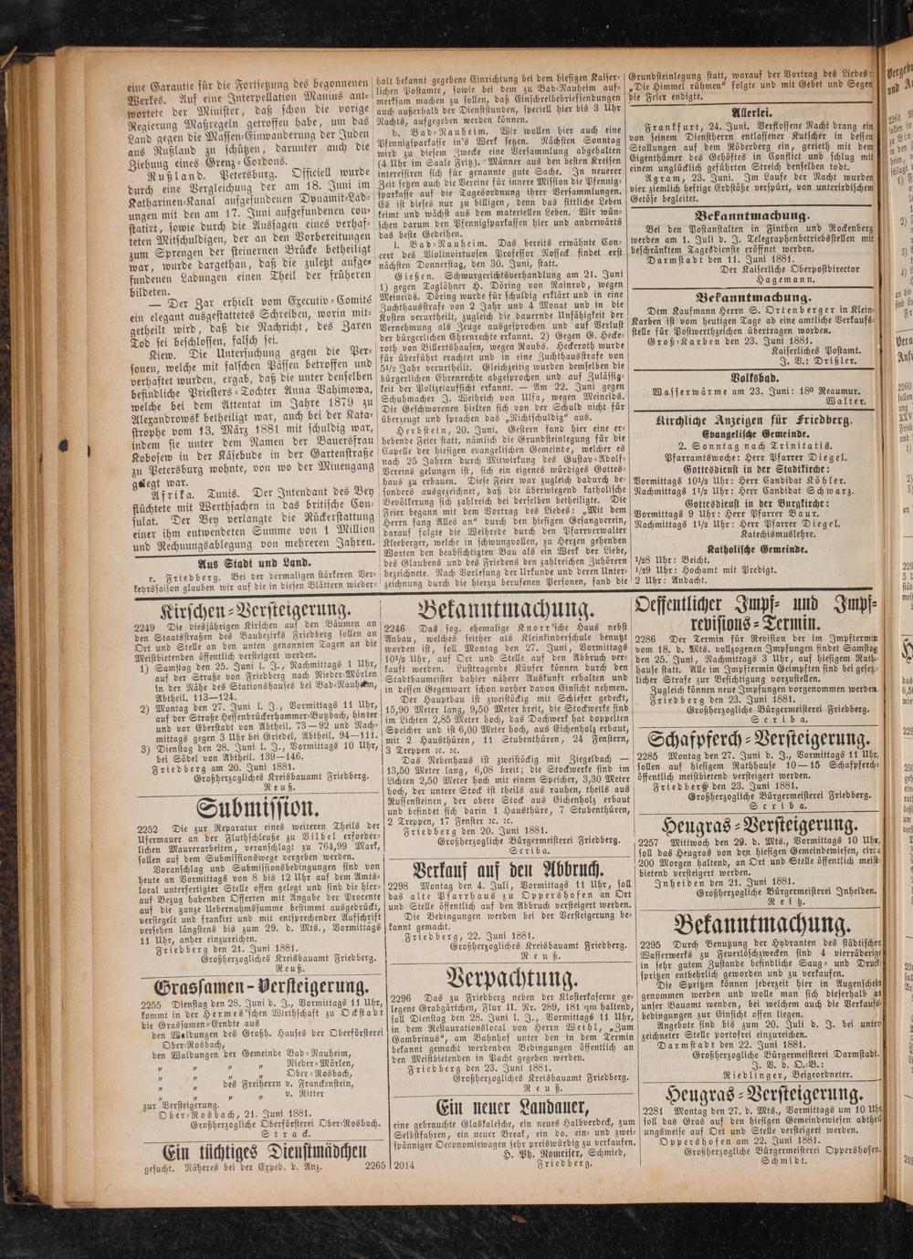 eine Garantie für die Fortse Fortsetzung des bego 6 89 e e et gonnenen holt bekannt ges ebene Einri. Werkes. Auf eine Interpellation Mauius ant⸗ lichen 1 6 1 fene Pe e bei dem hiesigen Kalser⸗ Grundsteinlegung statt ö wortete der Minister, daß schon die vori merksam machen zu sollen, daß Gif Bad⸗Nauheim auf-„Die 10 00 1 15 fia e eee Regierung Maßregeln getroffen habe 17 auch außerhalb der Wien e e die Feier endigte. folgte und mit Gebet und Segen 3 Land gegen die Massen⸗Einwanderung 1 1 en werden 1 5 eiell hier bis 3 Uhr 4 1 aus Rußland zu schütze 55 N A ad⸗Nauheim. Wir u ö 1 erlei. Ziehun Nn schüßen darunter auch die Pfennigsparkasse ins Werk fegen. f hier auch eine Frankfurt, 24. Juni. Verflossene N 51 1 9 eines Grenz-Cordons. wird zu diesem Zwecke eine Versa N Sonntag von seinem Dienstherrn el ce acht drang ein n 9 0 Petersburg. Officiell wurde ae 0 5 Fritz.. Männer e eee Gig ahe au en e een 30 1 Dae urch eine Vergleichung der am 18. n interessiren ich für genannte gute S reisen Eigenthümer des Gehöftes in C 0 1 em 0 5 9 9 ni 0 I te gute Sache. N 5 1 n Confliet un In den! Katharinen-Kanal aufgefundenen Dynämst abe n ee 1 5 innere Mission die fem eee 5 Streich nean e mit ben, f f N N Lad⸗ dar alle or ˖ l f n a a ungen mit den am 17. Juni aufgefundenen con— Es ist dieses nur zu W e aber gde heft e Erdßöhe verszürt 5 Nacht wurden z 5 statirt, sowie durch die Aussagen eines verhaf⸗ keimt und wächst aus dem mitkrtelken l Leben Getöse begleitet.„ von unterirdischen ö 1 0 teten Mitschuldigen, der an den Vorbereitt e e Bede hen, n a und anderwerts V 1 1 zum Sprengen der steinernen Brücke b 1 8 Gedeihen. anderwärts 12 ekanntmachung. 10 war, wurde dargethan, daß die zuletzt 105 1 e 1 bereits erwähnte Con- 1 n 0 Finthen und Rockenberg 9 1. Ladungen einen Theil der 1 5 nächsten Donnerstag, den 30. 905 11155 findet erst elde nen Tagesdienste 1 1 mit i 135 ildeten. 5 Gießen. Schwurgerichts 5 5 armstadt den 1 N gerichtsverhandlun 2 n 11. Juni 1881. 90 1* Der Zar erhielt vom Epecutiv-Comite Mendes Bi i Aae Der Kaiserliche Oberpostdirector f f 1 ein elegant ausgestattetes Schreiben, worin 3 5 ee 4 1 und in eine 8 195 7 0; 1„osten a und 0 70 getheilt wird daß die Nachricht, des Zar Kosten verurtheilt, 1 onat und in die Bekanntmachung. i 10 Tod sei beschlossen, falsch sei en Vernehmung als Zeuge aus öden Unfähigkeit der Dem Kaufmann Herrn S. Ort 8 11 0 5 Kiew. Die Untersuchung gegen die P i Ehrenrechle erkannt, 5) i fur Pf heutigen Tage ab ene antlihe Vert 5 fog; 5 8 Sed er⸗ v Bi 8 3„ Hecke⸗ 1 1 5 aufs⸗ 1 welche mit falschen Pässen betroffen 900 dae ehe a. wurde de e e i 5 verhaftet wurden, ergab, daß di a 51½ Jahr ver ö in eine Zuchthausstrafe von r i 45 7 5 ö die unter denselben bu Jahr verurtheilt. Gleichzeiti f Kaiserli Vera befindliche Priesters⸗Te e bürgerlichen Ehr zeitig wurden demselben die iserliches Postamt. s⸗Tochter Anna Vahimow kei en Ehrenrechte abgesprochen und 55 J. V.: Dri welche bei dem Attentat in mowa, keit der Poltzelaufsicht erkannt. 1 am 2. auf Zulässig⸗ 3 Auf 0 0 Jahre 0 S 5 5. Am 22. J Alexandrowsk betheiligt war, 900 bei dr dae. Die Gese renden elke 1 wegen Weines. Wasserwärme 1 f 0 Sen vom 13. März 1881 mit scholdi war, er und sprachen üb ee nicht für Juni: 180 Megan 15 6 U indem sie unter dem Namen der B war, Herbstein 20. is„Nichtschuldig“ aus. 5 alter. ollen 5 a 8 auersfra e Juni. Gestern d hi. Air 2 i 2 8 Kobosew in der Käsebude in der 1 d 5 statt, nämlich die dez 152 0 1 Anzeigen für Friedberg. 117 zu Petersburg wohnte, von wo der Mi nach 25 r hiesigen evangelischen Gemeinde, welch vangelische Gemeinde. Filed gaegt war. er Minengang 9 25 Jahren durch Mitwirkung des Gust her es 2. Sonntag nach Trint Ind Afrik⸗ 3 1 gelungen ist, sich ein eigenes e Pfarramtswoche: Herr 1 1 10 5 a. Tunis. Der Intendant des Bey f d zu erbauen. Diese Feier war zugleich dadur 6755 Gottesdienst in der S 81 iegel. flüchtete mit Werthsachen in das britische C Be ers ausgezeichnet, daß die überwiegend m bes Vormittags 10½ Uhr: a eee sulat. Der B ö 1 5 on- Bevölkerung sich zahlreich bei ders gend katholische Nachmittags 11 hr: Herr Candidat Köhle 5 . 5 ey verlangte die Rückerstattung Feier begann mit dem Vortr rselben betheiligte. Die ags 1½ Uhr: Herr Candidat Sch r. 20 ö einer ihm entwendeten Summe von 1 Million Herrn fang Alles an 9 des Liedes:„Mit dem Gottesdienst in der Burgki ch warz. 9 und Rechnungsablegung von mehreren Jahren Ae folgte die Weihrede e Aae Here Pfarre Wü 5 .. Kleeberger, welche in schwungvolle zfarrverwalter ag 2 Uhr: Herr 1 Aus Stadt und Land. were en zeabsigsten Ben a d We der diere Seeder r. Friedberg. Bei der dermaligen stä 5 es Glaubens und des Friedens d e Katholi f 5 keyrssaison glauben wir auf die i ane stärkeren Ver- bezeichnete. Nach Vor Friedens den zahlreichen Zuhörern ½8 Uhr: Bei atholische Gemeinde. glauben wir auf die in diesen Blättern wieder⸗ zeichnung 1588. 9 und deren Unter⸗ 120 Uhr; 0 i Kirschen⸗Versteigerun dente belag ln e Ib. e 225 1 8 15 U 9 N 5 50 2249 Die dies jährigen Rirs 6 4 Bekan 5 b 8 schen auf den Bäumen 0 In ffe städ 9 7 i en d e Friedberg sollen an ga Das sog. ehemalige achung. Oe eutlicher Impf⸗ und Impf⸗ ef ra 5 0 nten genannten Tagen die Anbau, w ches sei ge Knorr sche Haus nebst 0 7 ee o 28. den 4., Kecr gen an die wurden if, gel Meanteg be 27. Junk, e e e rebi ions⸗ Termin. r 5 daun l. J. Nachmittags 1 Uhr, 10% Uhr a rt und 8 7. Juni, Vormittags er Termin für Revist auf der Straße von Fried 8 auß ee, hr, auf Ort und Stelle auf d gs vom 18. d. V on der im Impfter— 4757 Nähe 955 Sen Baß Nan eu 6 e We Käufer ane 155 1 25.„ heft Senf theil. 113—124. 5 1 tbaumeister dahier nähere Auskunft erhal hause statt. Alle im r, auf hiesigem Rath⸗ 2) Montag den 27. Juni l. 3 5 in dessen Gegenwart schon vorher dav erhalten und licher St Impftermin Geimpften sind bei 0 3 I., Vormittags 11 Uh Der Haup 1 ther davon Einsicht n