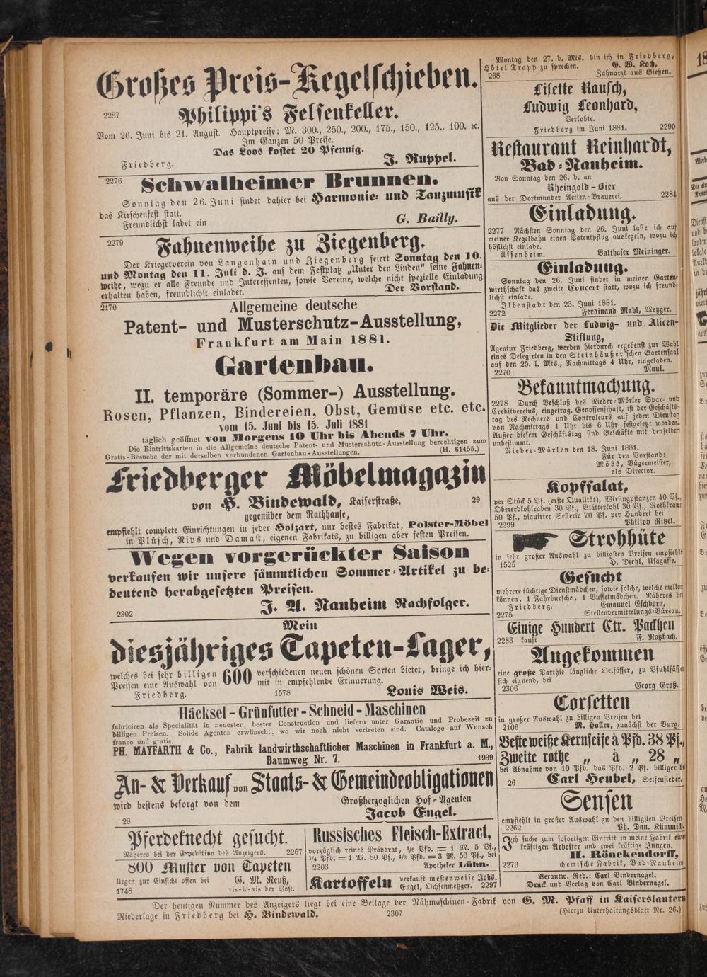 Der heutigen Nummer des Anzeigers liegt bei eine Beilage der Nähmaschinen-Fabrik von G Niederlage in Friedberg bei H. Bindewald. 5 5