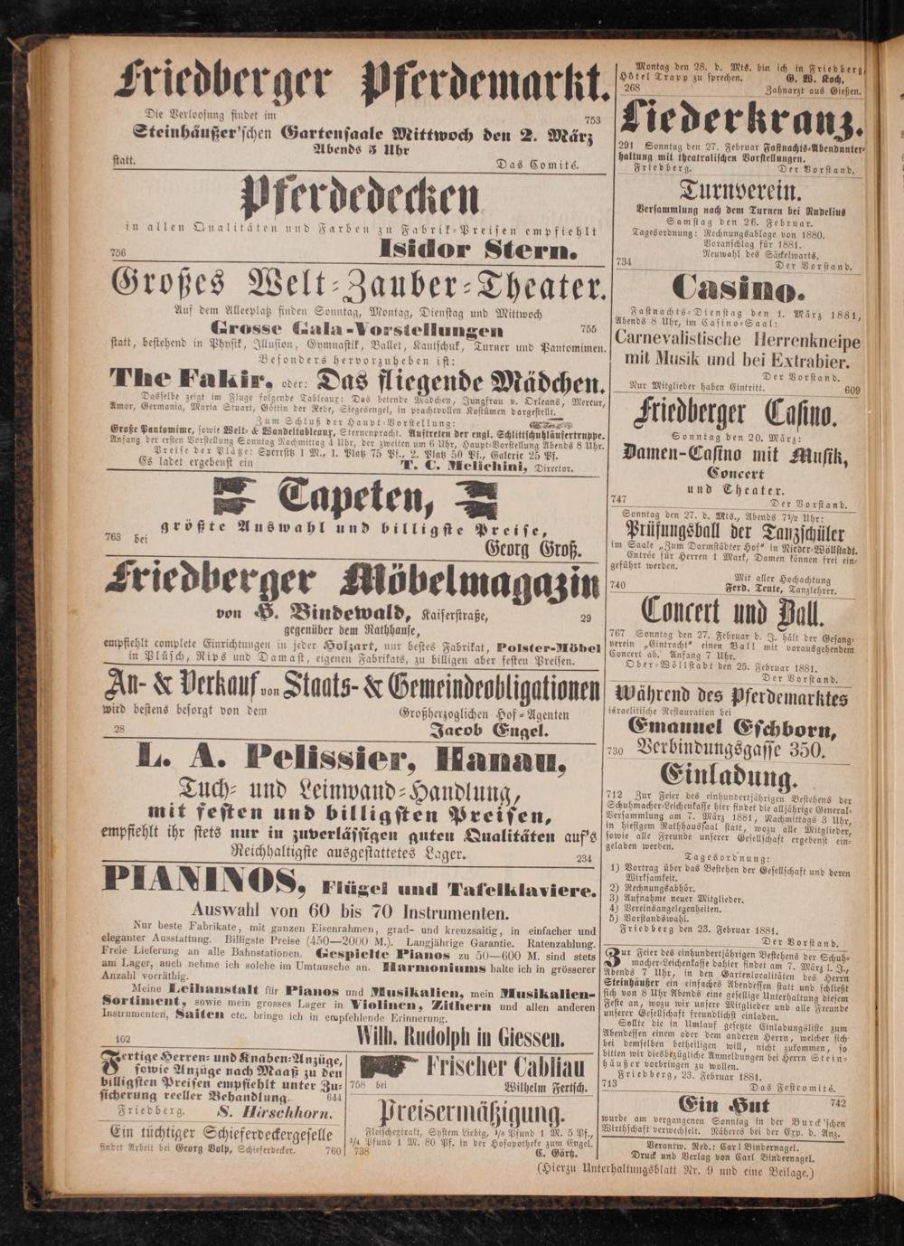 Druck und Verlag von Carl Bindernagel. (Hierzu Unterhaltungsblatt Nr. 9 und eine Beilage.)