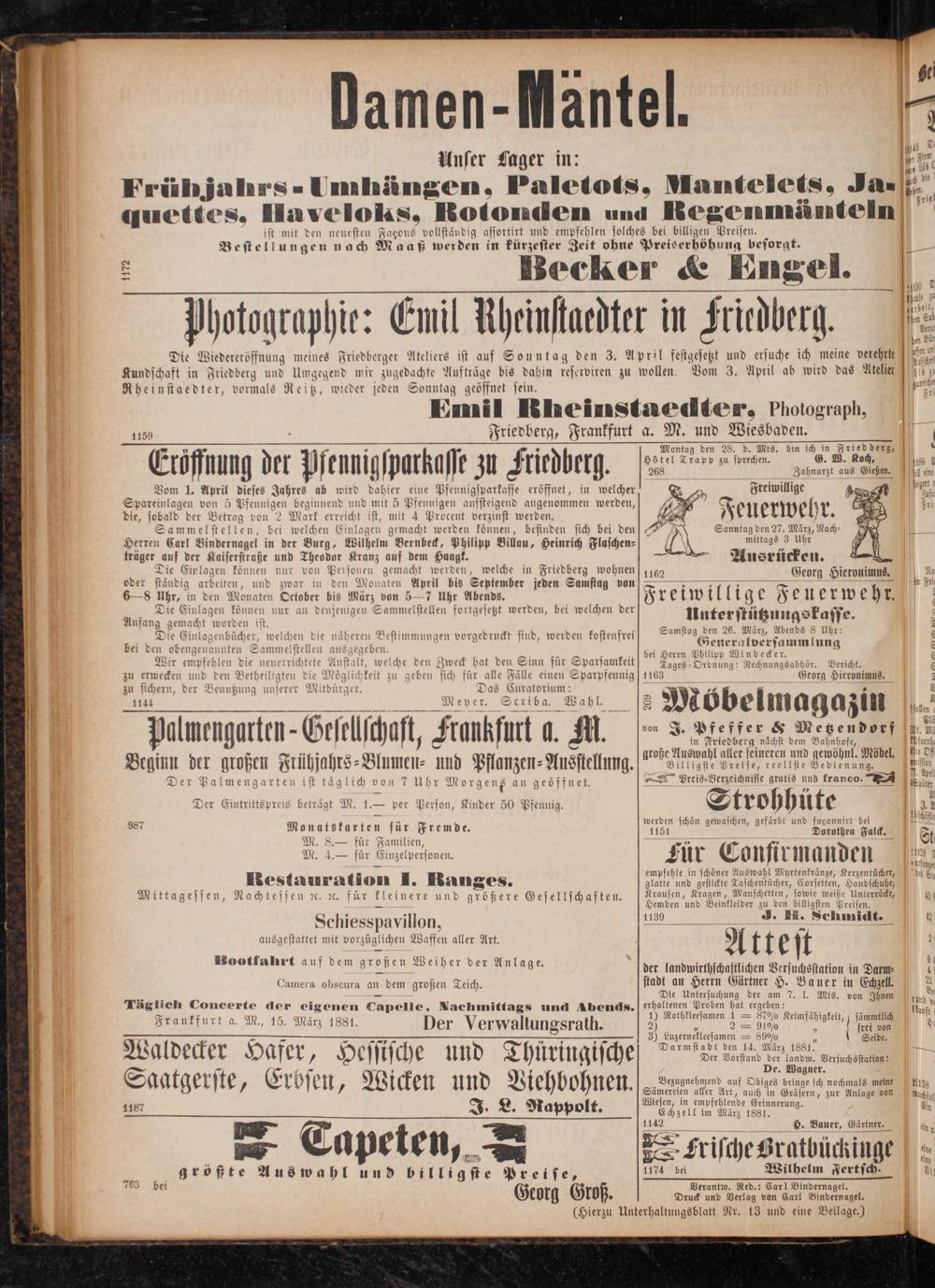 Täglich Concerte der eigenen Capelle, Nachmittags und Abends. Frankfurt a. M. 15. März 1881. Der Verwaltungsrath.