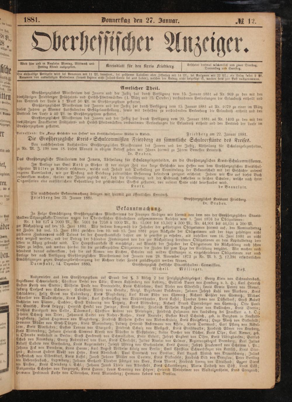 NW 8 6 en e l der.* 7 1 5 M. ö N t dreimal n 6 u wer 7 7 N e 755 Kreisblatt für den Kreis Friedberg We E er Die einspaltige Petitzeile wird bei Annoncen mit 11 Pf. berechnet, bet größerem Tabellen- oder Ziffersatz mit 14 Pf., bei Reelgmen mit 22 Pf.; e Beleg kestet 9 f. Annoncen von auswärtigen Einsendern(soweit Letztere nicht Jahres-Conko bel uns haben„ welchen der Betrag nicht beigefügt ist, werden stets Pest nachgenommen. ——— Amtlicher Theil. Großherzogliches Ministerium des Innern und der Justiz hat durch Verfügung vom 15. Januar 188t ad Nr. 969 zu den mit den diesjabrigen Friedberger Frübjahrs⸗ und Herbst⸗Pferdemärkten(4. März und 25. October] verbundenen Verloosungen die Erlaubniß ertheilt und en Vertrieb der Loose a1 Mark 50 Pf. im Großherzogthum gestattet. N Den Ministerium des Innern und der Justiz hat durch Verfügung vom 15. Jauuar 1881 ad Nr. 1079 zu einer im März berg. ieses Jahres zu Worms stattfindenden Geflügelausstellung, sowie mit derselben zu verbindenden Verloosung die Erlaubniß ertheilt und den Duder⸗ Vertried der Loose à 40 Pf. im Großherzogthum gestatt Großherzogliches Ministerium des Innern und der Justiz hat durch Verfügung vom 20. Januar 1881 ad Nr. 1493 zu den mit den — diesjahrigen Frankfurter Frühjahrs- und Herbst-Pferdemärkten verbundenen Verloosungen die Erlaubniß ertheilt und den Vertrieb der Loose im 9 Großherzogthum gestattet. 1 Betreffend: Die„Kurze Geschichte von Hessen“ von Kreisschulinspector Müller in Alsfelt Friedberg am 22. Januar 1881. Die Großherzogliche Kreis-Schulcommission F: tiedberg an saͤmmtliche Schulserstande des Kreises. Von nachstehendem Ausschreiben Großherzoglichen Ministertume s Innern und der Justiz, Abtheilung für Schulangelegenheiten, 2 u Nr. M. J. 198 vom 18. dieses Monats in obigem Betreff geben n Ihnen hiermit zu Ihrem Bemessen Kenntniß. Hi nd 0 Dr. Brade Das Großberzogliche Ministerium des Junern, Abtheilung für Schulangelegenbeiten, an die Großherzoglichen Kreis-Schulcommissionen. . Im Verlage von Emil Roth zu Gießen ist vor einiger Zeit eine kurze Geschichte von Hessen von dem Großherzoglichen Kreisschul⸗ g laber Müller zu Alsfeld erschienen, welche nach Juhalt und Darstellung zur Vermittelung. der Bekanntschaft mit der Geschichte unseres tacltien engeren Vaterlandes, wie zur Weckung und Belebung patriotischer Gesinnung besonders geeignet erscheint. Indem wir Sie auf dieses Buch A dufmerksa m machen, theilen wir Ihnen zugleich mit, daß die Einführung und der Gebrauch desselben in solchen Schulen, welche nach ihrer 1 Organisation eine ausführlichere Behandlung des geschichtlichen Stoffes gestatten, von unserer Seite nicht beanstandet wird Tel. 0 Knorr de Beauclair „ne 8 Die nachstehende Bekanntmachung bringen wir hiermit zur offentlichen Kenntniß. .— Friedberg den 25. Januar 1881. Großherzogliches Kreisamt Friedberg. N Dr. Braden. Bekanntmachung. 4 1 In Folge Ermächtigung Großherzoglichen Ministeriums der Finanzen kür digen wir hiermit von dem von Staats— eus schulden⸗Tilgungskasse⸗Direction wegen der Oberhessischen Eisenbahnen aufgenommenen Anleben Juni 1876 die Obligatio Nr. 1 bis 127 à 2000 M., Nr. 7001 bis 7258 à 1000 M., Nr. 15,00t bis 15,502 à r. 44,901 bis 46,151 à 200 M. aber dur Rückzahlung auf den 15. Juni 1881. Wir fordern demgemäß die Inhaber der gekündigten Obligationen hiermit auf, den Nominalbetrag mit Zinsen bis incl. 15. Juni 1881 zwischen dem 10. und 15 Juni 1881 gegen Ruͤckgabe der Obligationen und der dazu gehörigen nicht . bee 8 Zinscoupons nebst Talons bei der Hauptstaatst sse dahier um so gew sser zu erheben, als dieselben vom 16. Juni 1881 an nicht a nehr verzinst werden, und der Betrag der fehlenden Zinsconpons von den zur Rückzahlung berufenen Obligationen an dem Kapitalbetrag der— 2 a selben in Abzug gebracht wird. Die Hauptstaat ts kasse st ermächtigt, auf Wunsch der haber der O die Rückzahlung uch schon 5 früher zu leisten, und werden hierbei für die zurückbezahlten Obligationen die Zinsen bis zum Tage der Einl vergütet. Wir machen noch F sonders darauf aufmerksam, daß die auf Namen von Kirchen, Schulen und' milden Stiftungen ꝛc. eingeschriebenen Obl nen nur nach ben. Vorlage der nach Verfügung Großherzoglichen Ministeriums des Innern vom 28. November 1873 zu Nr. M. d. J. 12.391 erforderlichen 8 Ermaͤchtigungen gegen Empfangsbescheinaung der Rechner dieser Fonds zurückbezahlt werden konnen. n Darmstadt, 14. Dezember 1880. Großherzoglich Hessische Staatsschulden-Commission. 1 b i Michell Moöllinger. Best. 1 1—*—* ab Ausgewiesen aus dem Großherzogthum auf Grund des F. 3 Absatz 2 des Seikagiskensgesebes! Georg Klein von Schraudenbach, 2. Bezirksamt Schweinfurth; Christian Beisel von Cöln; Simon Kahlen berg von Koblenz; Gottlieb Bauer von Homburg v. d. H.; Karl Heinrich