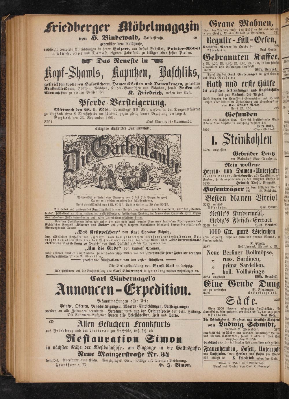 Die Verlagshandlung von Ernst Keil in Leipzig. Alle Postämter und die Buchhandlung von Carl Bindernagel in Friedberg nehmen Bestellungen an.