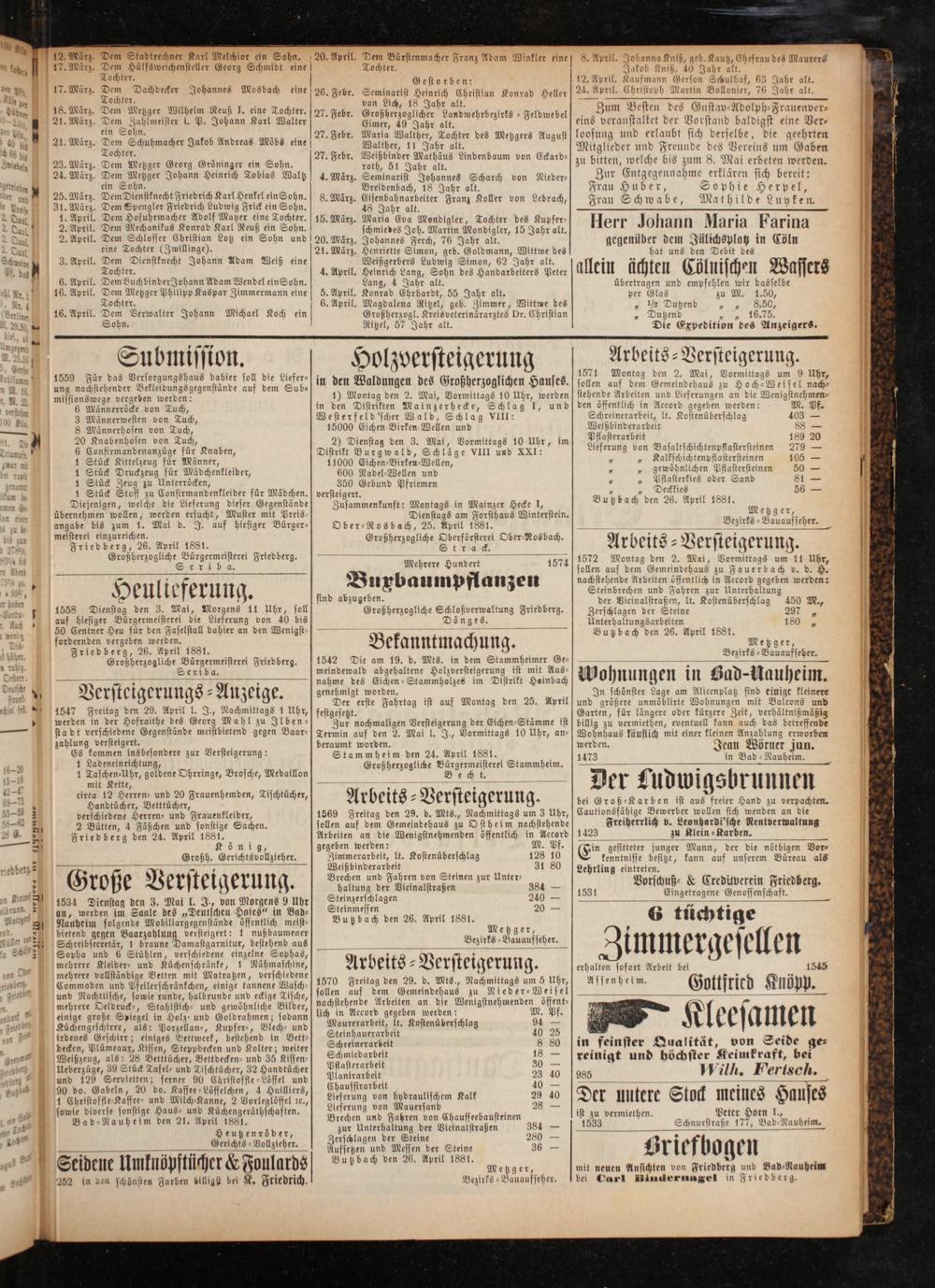 e Tochter. a Gestorben: 12. April. Kaufmann Gerson Schulhof, 63 Jahr alt. 17. Marz. N Dachdecker Johannes Mosbach eine 26. Febr. Seminarist Heinrich Christian Konrad Heller 24. April. Christoph Martin Bollonier, 76 Jahr alt. Tochter. von Lich, 18 f 5. März. Dem Metzger Wilhelm Reuß J. eine Tochter. 27. Febr. Großherzoglicher dendwehrbezirts⸗ Feldwebel Bum wesen des Gusen ebelph Saen 21. Marz. Dem Zahlmeister i. P. Johann Karl Walter Eimer, 49 Jahr alt. eins veranstaltet der Vorstand baldigst eine Ver— ein Sohn. 27. Febr. Maria Walther, Tochter des M 2 loosung und erlaubt sich derselbe, di t n 8 9 a. er, etzgers August] loosung aubt sich derselbe, die geehrten 21. März. e Jakob Andreas Möbs eine We 2 185 17 1 alt. 80 e Mitglieder und Freunde des Vereins um Gaben 85. 2 27. Febr. eißbinder thäus Li v 2 N 8 4 938; 23. März. Dem Metzger Georg Gröninger ein Sohn. n 51 Jahr 175 eenvaucß don carbs zn bite h on zum 8. Mai erbeten werden. 24. März. Dem Metzger Johann Heinrich Tobias Waltz] 4. März. Seminarist Nöanges Schurch von Nieber⸗ Zur Entgegennahme erklären sich bereit: . 5. er or Breldenbach, 18 Jahr alt. Frau Huber, Sophie Herpel, März. Dem Dienstknecht Friedrich Karl Henkel ein Sohn.] 8. März. Eisenbahnarbeiter Franz Koller von Lebrach Fr S Y de 31. März. Dem Spengler Friedrich Ludwig Frick ein Sohn. eärz 755 N 155270 Franz Ko ebrach, Frau Schwabe, Mathilde Luyken. 1. April. Dem Hofuhrmacher Adolf Mayer eine Tochter. 15. März. Marla Eva Mondigler, Tochter des Kupfer— 1 · f J Igri 2. April. Dem Mechanikus Konrad Karl Reuß ein Sohn. schmiedes Joh. Martin Mondigler, 15 779 152 Hei 1 Johann Maria E Arina 2. April. Dem Schlosser Christian Lotz ein Sohn und 20. März. Johannes Ferch, 76 Jahr alk. gegenüber dem Jülichsplatz in Cöln 5 4 l c 0 21. März. Henriette Simon, geb. Goldmann, Wittwe des hat uns den Debit des 3. April. Dem Dienstknecht Johann Adam Weiß eine Weißgerbers Ludwig Simon, 62 Jahr alt. Hei 4 Zsui „Tochter.. 4. April. Heinrich Lang, Sohn des Handarbeiters Peter allein ächten Cölnischen Wassers 6. April. Dem Buchbinder Johann Adam Wendel ein Sohn. Lang, 4 Jahr alt. übertragen und empfehlen wir dasselbe 16. April. Dem Metzger Philipp Kaspar Zimmermann eine] 5. April. Konrad Ehrhardt, 55 Jahr alt. per 5 zu M. 1.50, 5 Tochter. 8 6. April. Magdalena Ritzel, geb. Zimmer, Wittwe des„ 1/2 Dutzend 51335 16. April. Dem Verwalter Johann Michael Koch ein Großherzogl. Kreisveterinärarztes Dr. Christian„ Dutzend 1 Sohn. Ritzel, 57 Jahr alt. Die Expedition des Anzeigers. 712* 2155 M— 2 Sub lverst Arbeits⸗ Submisston. Holzversteigerung Arbeits-Versteigerung. 1559 Für das Versorgungshaus dabier soll die Liefer- j ö 8 nn mene den. mal, newitese ung nachstehender Bekleidungsgegenstände auf dem Sub— 8 den Waldungen! des Großherzoglichen Hauses. enen e cee missionswege vergeben werden: 1) Montag den 2. Mai, Vormittags 10 Uhr, werden stehende Arbeiten und Lieferungen an die? Wenigstnehmen⸗ 6 a erescke bon Tuch, in den Distrikten Mainzerhecke, Schlag 1, und den öffentlich in Accord gegeben werden: M. Pf. 3 Männerwesten von Tuch, Westerfeld'scher Wald, Schlag VIII: Sacheenkrarkeit, lt. Kostenüberschlag 403— 8 Männerhosen von Tuch, 15000 Eichen Birken Wellen und Weißbinderarbeit 8 Pflasterarbeit 189