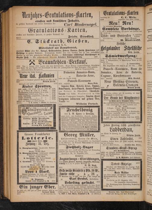 errichtet und wird vorerst jeden Montag und Donnerstag Jemand zum Verkaufe am Platze sein. Hanau a. M., 10. Dezember 1881. 4156