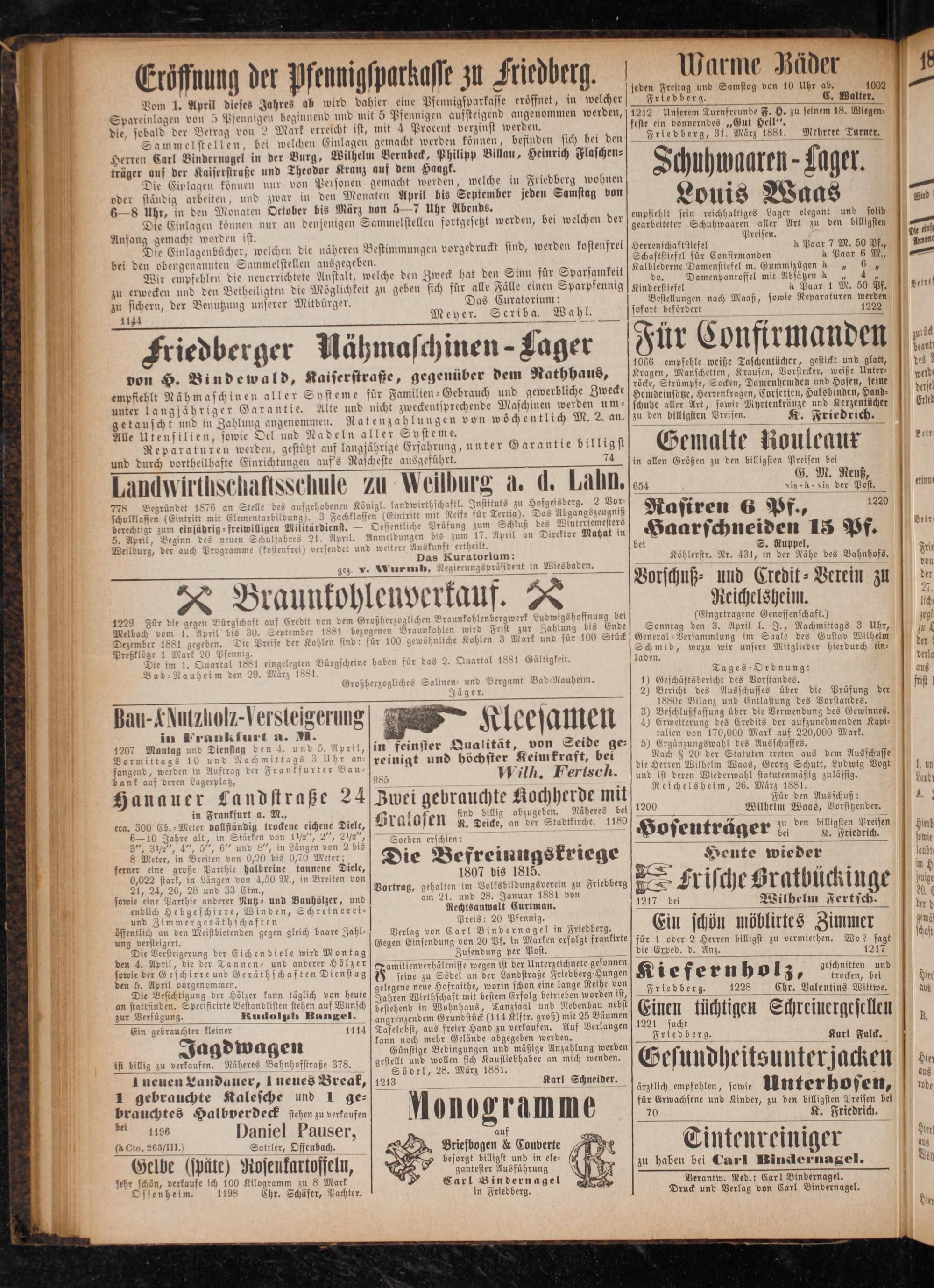 jeden Freitag und Samstag von 10 Uhr ab. Friedberg. 1212 Unserem Turnfreunde F. H. zu seinem 18. Wiegen⸗ feste ein donnerndes„Gut Heil“. Friedberg, 31. März 1881.
