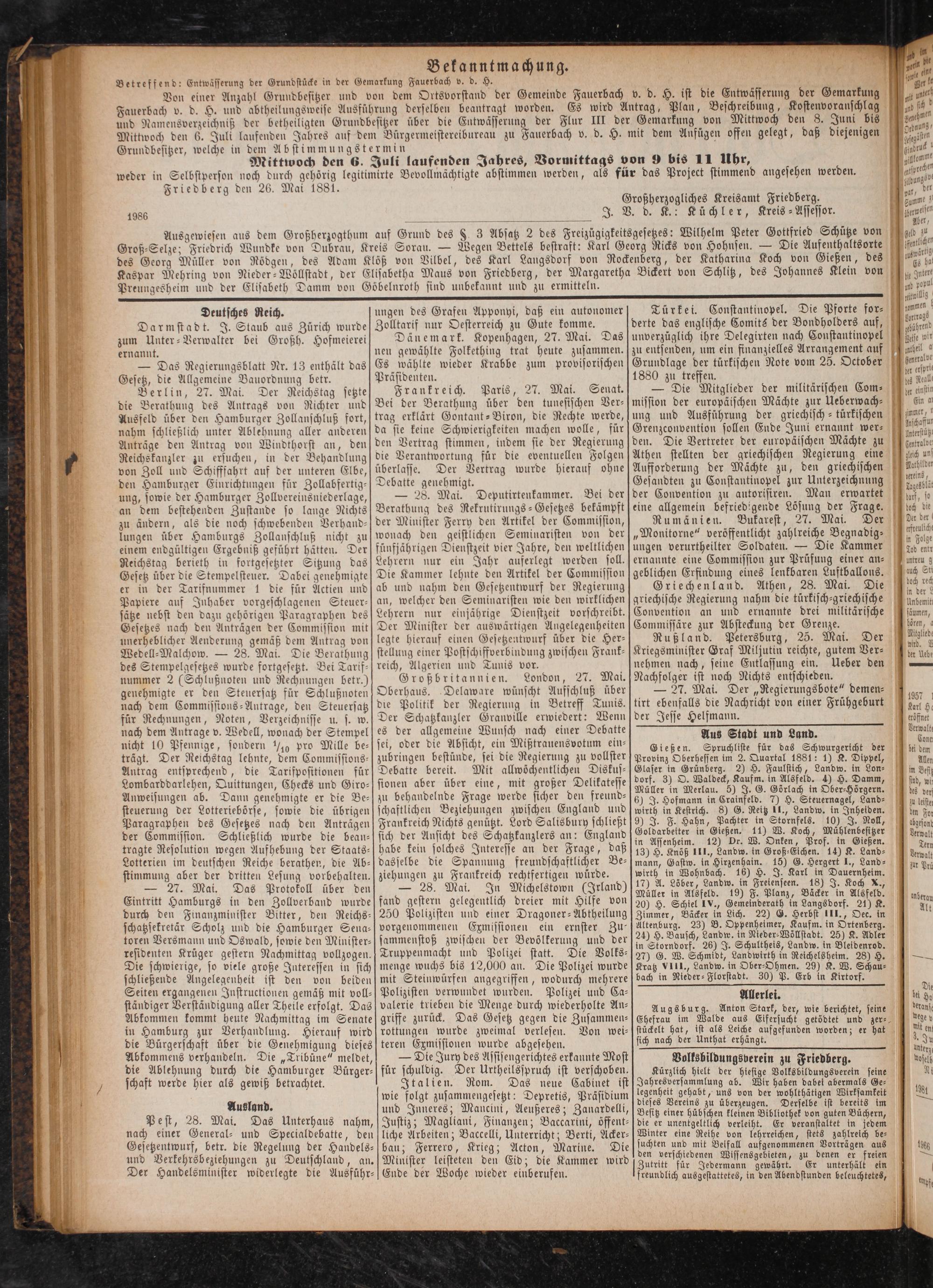 Gießen. Spruchliste für das Schwurgericht der Provinz Oberhessen im 2. Quartal 1881: 1) K. Dippel, Glaser in Grünberg. 2) H. Faulstich, Landw. in Lon⸗ dorf. 3) O. Waldeck, Kaufm. in Alsfeld. 4) H. Damm, Müller in Merlau. 5) J. G. Görlach in Ober⸗Hörgern. 6) J. Hofmann in Crainfeld. 7) H. Steuernagel, Land⸗ wirth in Kestrich. 8) G. Reitz 11., Landw. in Inheiden. 9) J. F. Hahn, Pachter in Stornfels. 10) J. Noll, Goldarbeiter in Gießen. 11) W. Koch, Mühlenbesitzer in Assenheim. 12) Dr. W. Onken, Prof. in Gießen. 13) H. Knöß III., Landw. in Groß⸗Eichen. 14) K. Land⸗ mann, Gastw. in Hirzenhain. 15) G. Hergert I., Land⸗ wirth in Wohnbach. 16) H. J. Karl in Dauernheim. 17) A. Löber, Landw. in Freienseen. 18) J. Koch X., Müller in Alsfeld. 19) F. Planz, Bäcker in Alsfeld. 20) H. Schiel IV., Gemeinderath in Langsdorf. 21) K. Zimmer, Bäcker in Lich. 22) G. Herbst III., Oec. in Altenburg. 23) B. Oppenheimer, Kaufm. in Ortenberg. 24) H. Bausch, Landw. in Nieder-Wöllstadt. 25) K. Adler in Storndorf. 26) J. Schultheis, Landw. in Bleidenrod. 27) G. W. Schmidt, Landwirth in Reichelsheim. 28) H. Kratz VIII., Landw. in Ober⸗Ohmen. 29) K. W. Schau⸗ bach in Nieder-Florstadt. 30) P. Erb in Kirtorf.