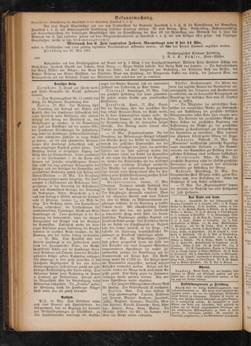 Großbritannien. London, 27. Mai. Oberhaus. Delaware wünscht Aufschluß über die Politik der Regierung in Betreff Tunis. Der Schatzkanzler Granville erwiedert: Wenn es der allgemeine Wunsch nach einer Debatte sei, oder die Absicht, ein Mißtrauensvotum ein— zubringen bestünde, sei die Regierung zu vollster Debatte bereit. Mit allwöchentlichen Diskus— sionen aber über eine, mit großer Dellikatesse zu behandelnde Frage werde sicher den freund— schaftlichen Beziehungen zwischen England und Frankreich Nichts genützt. Lord Salisbury schließt sich der Ansicht des Schatzkanzlers an: England habe kein solches Interesse an der Frage, daß dasselbe die Spannung freundschaftlicher Be— ziehungen zu Frankreich rechtfertigen würde. 28. Mai. In Michelstown(Irland) fand gestern gelegentlich dreier mit Hilfe von 250 Polizisten und einer Dragoner-Abtheilung vorgenommenen Exmissionen ein ernster Zu— sammenstoß zwischen der Bevölkerung und der Truppenmacht und Polizei statt. Die Volks— menge wuchs bis 12,000 an. Die Polizei wurde mit Steinwürfen angegriffen, wodurch mehrere Polizisten verwundet wurden. Polizei und Ca— valerie trieben die Menge durch wiederholte An— griffe zurück. Das Gesetz gegen die Zusammen— rottungen wurde zweimal verlesen. Von wei— teren Exmissionen wurde abgesehen.