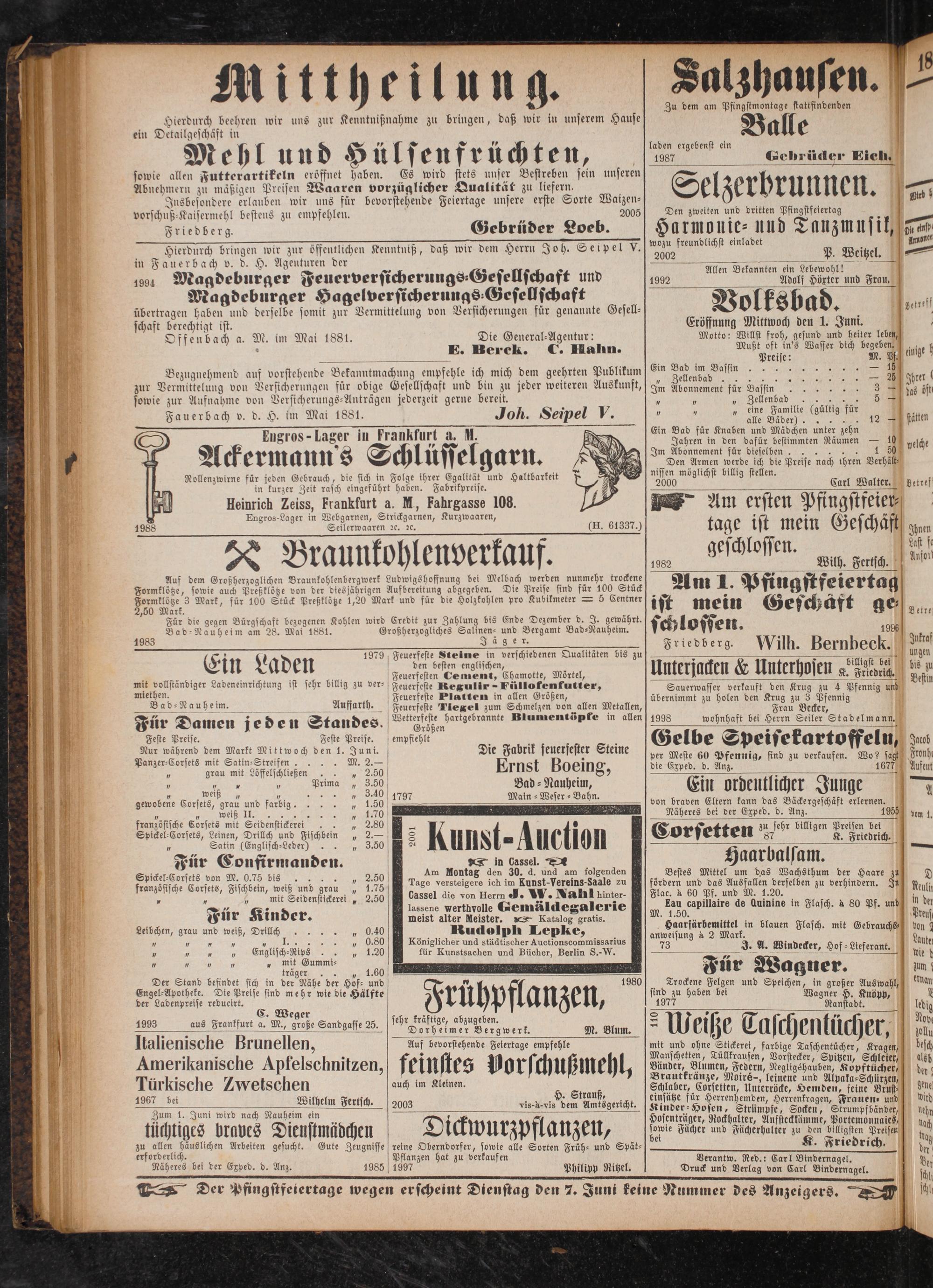 sowie allen Futterartikeln eröffnet haben. Es wird stets unser Bestreben sein unseren Abnehmern zu mäßigen Preisen Waaren vorzüglicher Qualität zu liefern. Insbesondere erlauben wir uns für bevorstehende Feiertage unsere erste Sorte Waizen— vorschuß-Kaisermehl bestens zu empfehlen. 2005 Friedberg. Gebrüder Loeb. Hierdurch bringen wir zur offentlichen Kenntniß, daß wir dem Herrn Joh. Seipel V. in Fauerbach v. d. H. Agenturen der 1001 Magdeburger Feuerversicherungs⸗Gesellschaft und Magdeburger Hagelversicherungs⸗Gesellschaft übertragen haben und derselbe somit zur Vermittelung von Versicherungen für genannte Gesell⸗ schaft berechtigt ist. Offenbach a. M. im Mai 1881.