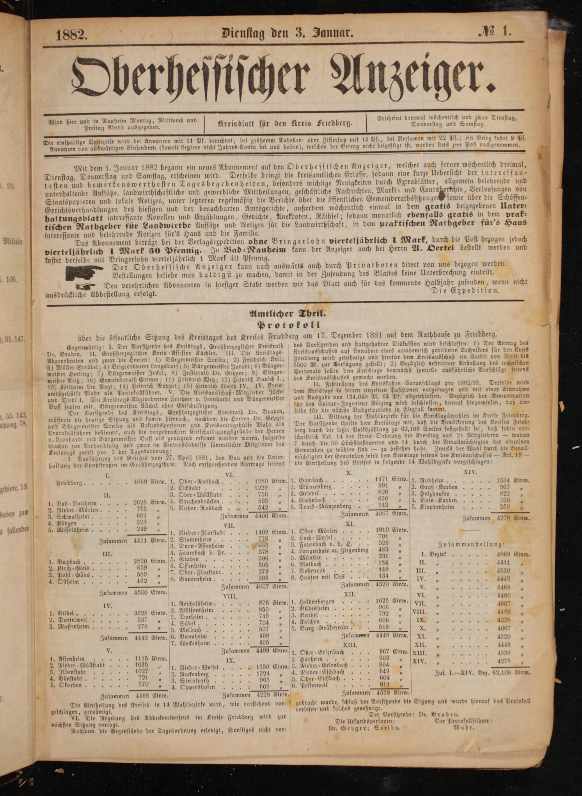 Mit dem 1. Januar 1882 begann ein neues Abonnement auf den Oberhessischen Anzeiger, welcher auch ferner wöchentlich dreimal, Dienstag, Donnerstag und Samstag, erscheinen wird. Derselbe bringt die kreisamtlichen Erlasse, sodann eine kurze Uebersicht der interesfan⸗