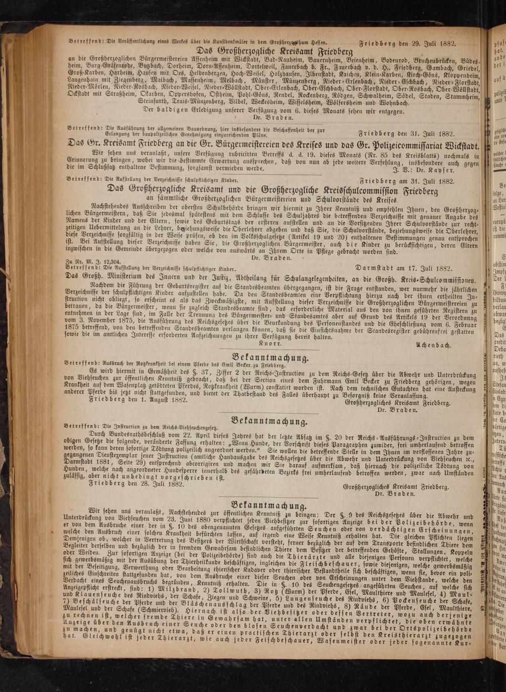 Friedberg den 1. August 1882. Großherzogliches Kreisamt Friedberg.