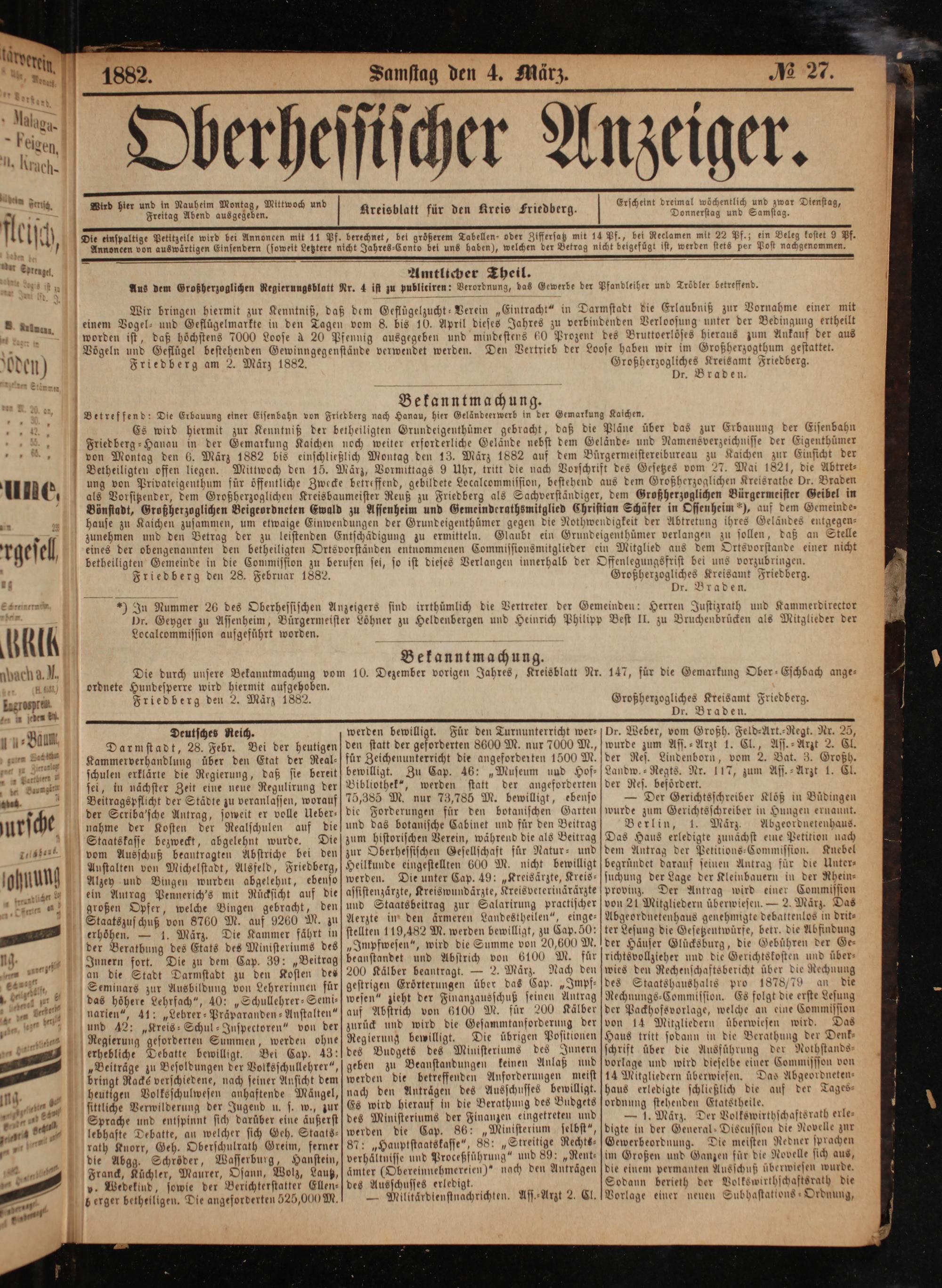 Friedberg am 2. März 1882. Großherzogliches Kreisamt Friedberg.