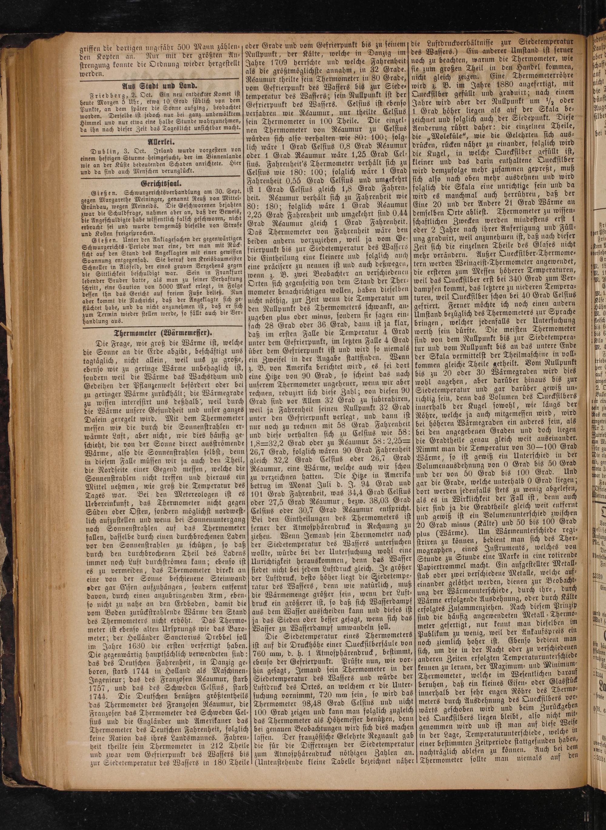 Die Frage, wie groß die Wärme ist, welche die Sonne an die Erde abgibt, beschäftigt uns tagtäglich, nicht allein, weil uns zu große, ebenso wie zu geringe Wärme unbehaglich ist, sondern weil die Wärme das Wachsthum und Gedeihen der Pflanzenwelt befördert oder bei zu geringer Wärme zurückhält; die Wärmegrade zu wissen interessirt uns deßhalb, weil durch die Wärme unsere Gesundheit und unser ganzes Dasein geregelt wird. Mit dem Thermometer messen wir die durch die Sonnenstrahlen er⸗ wärmte Luft, aber nicht, wie dies häufig ge— schieht, die von der Sonne direct ausströmende Wärme, also die Sonnenstrahlen selbst, denn in diesem Falle müssen wir ja auch den Theil, die Nordseite einer Gegend messen, welche die Sonnenstrahlen nicht treffen und hieraus ein Mittel nehmen, wie groß die Temperatur des Tages war. Bei den Metereologen ist es Uebereinkunft, das Thermometer nicht gegen Süden oder Osten, sondern möglichst nordwest— lich aufzustellen und wenn bei Sonnenuntergang noch Sonnenstrahlen auf das Thermometer fallen, dasselbe durch einen durchbrochenen Laden vor den Sonnenstrahlen zu schützen, so daß durch den durchbrochenen Theil des Ladens immer noch Luft durchströmen kann; ebenso ist es zu vermeiden, das Thermometer direkt an eine von der Sonne beschienene Steinwand oder gar Eisen aufzuhängen, sondern entfernt davon, durch einen anzubringenden Arm, eben— so nicht zu nahe an den Erdboden, damit die vom Boden zurückstrahlende Wärme den Stand des Thermometers nicht erhöht. Das Thermo— meter ist ebenso alten Ursprungs wie das Baro— meter; der Holländer Sanctorius Drebbel soll im Jahre 1630 die ersten verfertigt haben. Die gegenwärtig hauptsächlich verwendeten sind: das des Deutschen Fahrenheit, in Danzig ge— boren, starb 1744 in Holland als Maschinen⸗ Ingenieur; das des Franzosen Réaumur, starb 1757, und das des Schweden Celsius, starb 1744. Die Deutschen benützen größtentheils das Thermometer des Franzosen Réaumur, die Franzosen das Thermometer des Schweden Cel— sius und die Engländer und Amerikaner das Thermometer des Deutschen Fahrenheit, folglich keine Nation das ihres Landsmannes. Fahren⸗ heit theilte sein Thermometer in 212 Theile und zwar vom Gefrierpunkt des Wassers bis zur Siedetemperatur des Wassers in 180 Theile