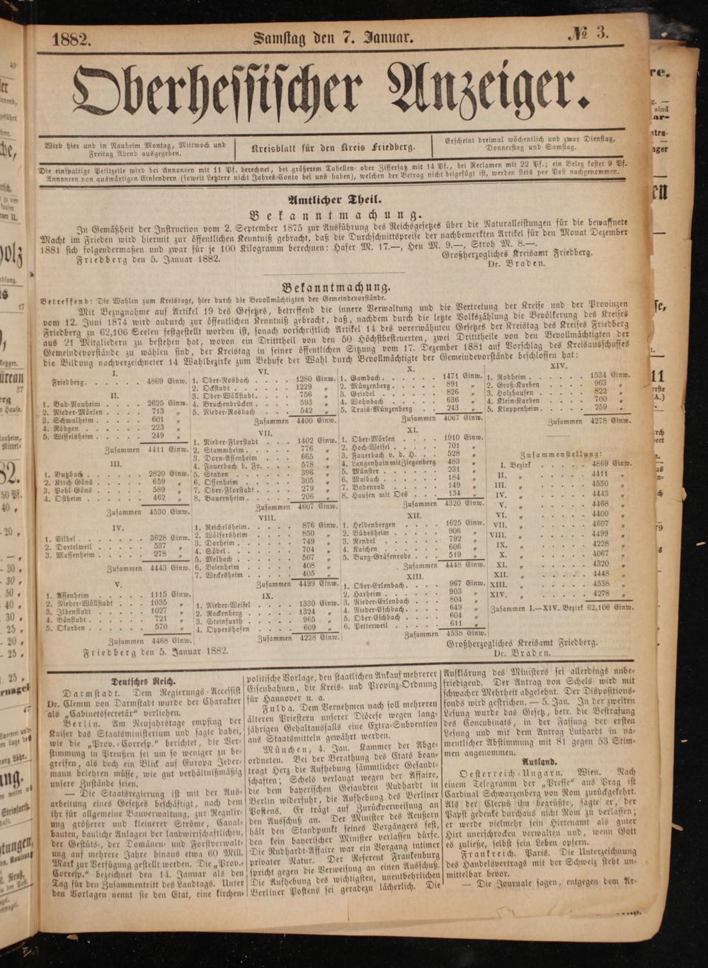 tan Fade i f 1 1 180 — beg 1869 Einw. 1280 Einw. 1. Gambach. 1471 Einw. 1. Ro 1534 Einw. n 1229 i 2. Münzenberg 891 5 2. 963 7 5 8 756 7 Ariedel 826 2 2. rg( 1. Bad N 625 Einw.— 1 N— 1. 5 822* 1 Hanse.* Nied r- Wörler 8„ 5939„ 4.. 696„ 4. Klein⸗Karben 700„ 3. Schwaig 1 801. e Münzenberg 243 5. Kloppenheim. 29„ 3. Schwal heim 601 1 zusammen 1400 Einw. Zusammen 4067 Einw. 1— 0 4. 0 5 223 2 g Zusammen 4278 Einw. 5. Wissels heim. 249 5 VII XI. — 1 dt 1402 Einw. 1. 1910 Einw. zusamme 1411 Einw. 2. 776 5 3. 701 4 3 665 3 e 1 tell 92 6 III. 50„ g.. f 1 zusammenstellung: 52 28 0. F 578 N 4. 2 enhain mit Ziegenberg— 5 1e 4869 Einw „ Bußz bah. 2820 Einw. 5. S J 396 5 5. Münster 23 4„* 1 22 2. Kirch Gons 659„ 6. Ossenbeim 305„ 6. Maibach 1188 3. N.— Pohl Goͤns 589 7. Ober⸗Florstad 279„ 7. Bodenrod 149„ III. 1530„ Ostheim 162 3 8. Bauernheim 206 8. Hausen mit Oes 134* 40* f gam 1 18 CF 1 zusammen 1320 Einw.. 1 1 8 sammer 1530 Einn zusamme 4000 iw. zusammen 102 nw. v. 5 4468* 5 VIII. Nl XII. 01 N 4400„ W, IV. 1. Re eim 876 Einw. 1. Heldenberger 1625 Einw. VII 4607 1 Einw. 2. N„. esheim 906 1 e eee, * f 3 9 1„„ — 3. 278 12 A4. 8 104„ 4. Kaichen g 606„ IX.„„ i .— 65. 507. 5. Burg⸗Gräfenroden. 519 1 5 4 N 4067 4 5 Zusammen 4443 6. 2 3 zusammen 1448 Einw. XI.„ 3 1 W̃᷑ 405 J 1 0,* 2— XII. n,„ ie an, 50 a g* Zusammen 4499 Einw. 1. Ober⸗Erlenbach. 967 Einw. XIII.„ 4588„ 10 2 5 1115 Einw. IX. 2. Harheim.. 903 1 xlv 4278 0 42 1— ee 1. Nieder⸗Weisel 1330 Einw. 3. Nieder-Erlenbach 804„„ 1 E 1 0.* 80„ 2. Rockenberg 1324„ 4. Nieder⸗Eschbach. 649„— Zusammen I. XIV. Bezirk 62,106 Einw. 8 5 i„ 3. Steinfurtl 7 965„ 5. Ober ⸗Eschbach 604„ 0: 9. 70 4 Sppersbofen 609„ 6. Petterweil 611 8 * Zusammen 4468 Ei zusammen 4228 Einw. Zusammen 4538 Einw. 8 5 Friedberg den 5. Januar 1882 Großherzogliches Kreisamt Friedberg. Ur. Braden. 5 1 f 1 Mert s 8 NI 4 ** f Deutsches Reich. politische Vorlage, den staatlichen Ankauf mehrerer Aufklärung des Ministers sei allerdings unbe— rnage Darmstadt. Dem Regierungs Accessist Elsenbahnen, die Kreis- und Provinz-Ordnung friedigend. 8 Der Antrag von Schels wird mit e. Clemm von Darmstadt wurde der Charakter für Hannover u. a. schwacher Mehrheit abgelehnt. Oer Otspostttons⸗ 1** 1 90 1 1 N 0„rere 1 N 8„ty 0 7 Jan N! r wei 1 als„Cabinetssecretär“ verliehen Fulda. Dem Vernehmen nach soll mehreren fonds wird gestrichen.— 5. Jan. In der zweiten Berlin. Am Neufahrstage empfing derf älteren Priestern unserer Dioͤcese wegen lang- Lesung wurde das Gesetz, betr. die Bestrafung 0 1. 2— 18 Ar* i 8 an 8— 1 ö does N 0 1 0 per N* Nor or 1 1 Kaiser das Staatsministerium und sagte dabei, jährigen Gehaltausfalls eine Extra-Subvention des Concubinats, in der Fassung der ersten nn d. f e eee 1 l N 74— 1 z. Les D de 9 N 2 1 08. wie die„Prov.⸗Corresp.“ berichtet, die Ver- aus Staatsmitteln gewaͤhrt werden. Lesung* mit dem Antrag Luthardt in na⸗ Löhr stimmung in Preußen set um so weniger zu be— München, 4. Jan. Kammer der Abge- mentlicher Abstimmung mit 8 gegen 33 Stim- 1. 1 1 4 5 1 Me der Ne es Etats bean- me eno f greifen, als doch ein Blick auf Europa Jeder ordneten. Bei der Berathung des Etate 380 ne Ausland ing. mann belehren müsse, wie gut verhältnißmäßig tragt Herz die Aufhebung sämmtlicher. 18 usland. 5 1 N 5 f 5 5— Sia 8 MW 0 91 unsere Zustände seien. schaften; Schels verlangt wegen der Affaire, e ste rreich-Ungarn. l Nach 7 4 8 1 1 8 ud D eine ole ar der Nresse? zus Pra 4— Die Staatsregierung ist mit der Aus-die dem bayerischen Gesandten Rud han f in 3 Telegramm der„J 1 aus* rag ist N a 19 F dos Ver or Far 0— 10* 0 zurü 5 0 f f 110 arbeitung eines Gesetzes beschaͤftigt, nach dem] Berlin widerfuhr, die Aufhebung des Berliner n Schwarzenberg von Rom zurd Eͤgekehrt e 1 2* n 5 1 1 5 2 2 7 1*** 0 8* Flerus oer„ gate** — 1 ihr für allgemeine Bauverwaltung, zur Regulir--Postens. Er trägt auf Zurückverweisung an] Als der Clerus ihn begrüßte, sagte er, der