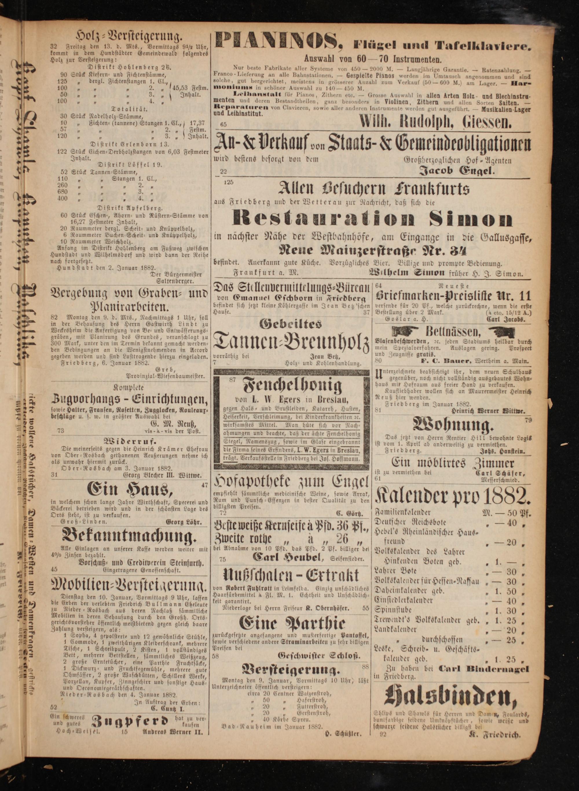 Niederlage bei Herrn Friseur R. Obernhöfer. 55 Spinnstube 1 30 N Eine P arthie Trewendt's Volkskalender geb.„ 1. 255 — l 1 Landkalender„— 20„ zurückgesetzte angefangene und musterfertige Pantoffel, N F 9 sowie verschledene andere Straminarbeiten zu sehr billigen*. urchsch ossen 8— 258, Preisen bei Le oͤfe, Schreib- u. Geschäfts— 58 Geschwister Schloß. kalender geb. 3 —— 88 0* Versteigerung. Zu haben bei Carl Wb de . 1 2 Montag den 9. Januar, Vormittags 10 Uhr, läßt! Unterzeichneter öffentlich versteigern: 4* elrea 20 Centner Watzenstroh, 1 1 3 50 1 Haferstroh, 2 1 9 5 20* Futterstroh, 3 5 Gerstenstroh, 8 hlips und Shawls für Her und Damen, Foulards, „ 40 Koͤrbe Spreu. buntfarbige seldene Umknoͤpf sowie weiße und Bad Nauheim im Januar 1882. schwarze seidene Halstücher billigst bei O. Schüßler. 92 K. Friedrich.