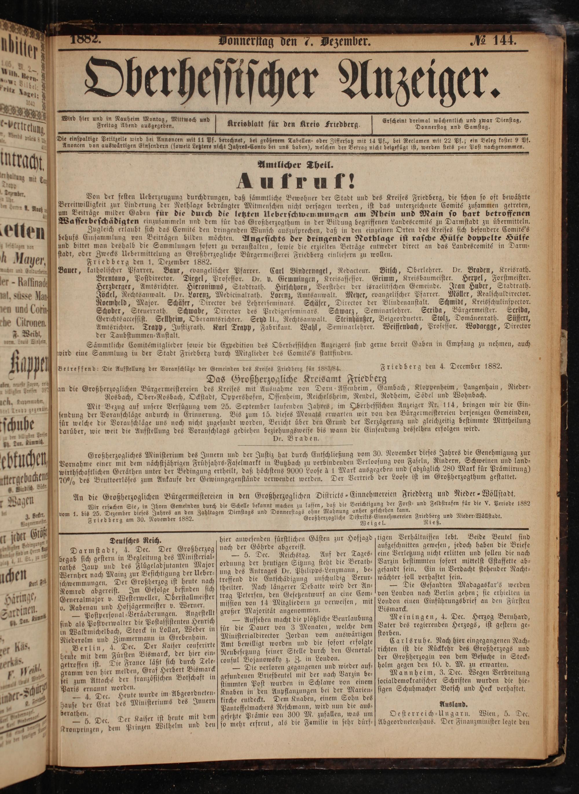 behufs Einsammlung von Beiträgen bilden möchten. Angesichts der dringenden Nothlage ist rasche Hülfe doppelte Hülfe 1 9 und bittet man deshalb die Sammlungen sofort zu veranstalten, sowie die erzielten Beträge entweder direct an das Landescomité in Darm— 1 stadt, oder Zwecks Uebermittelung an Großherzogliche Bürgermeisterei Friedberg einliefern zu wollen. Friedberg den 1. Dezember 1882. Bauer, katholischer Pfarrer. Baur, evangelischer Pfarrer. Carl Bindernagel, Redacteur. Brentano, Postdirector. Diegel, Professor. Dr. v. Gemmingen, Kreisassessor.