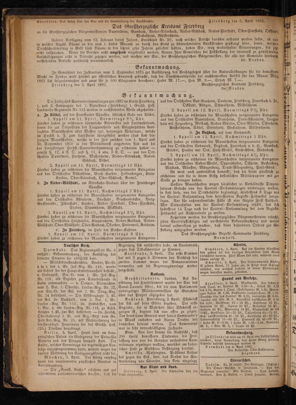 Die Fruͤhjahrs-Controlversammlungen pro 1882 im Kreise Friedberg, 1. und 3. Compagnie des 2. Bataillons(Friedberg) 1. Großh. Hess. Landwehr-Regiments Nr. 115 werden in nachstehender Weise abgehalten: A. In Vilbel, auf der Frankfurter Chaussee, südliches Ende von Vilbel.