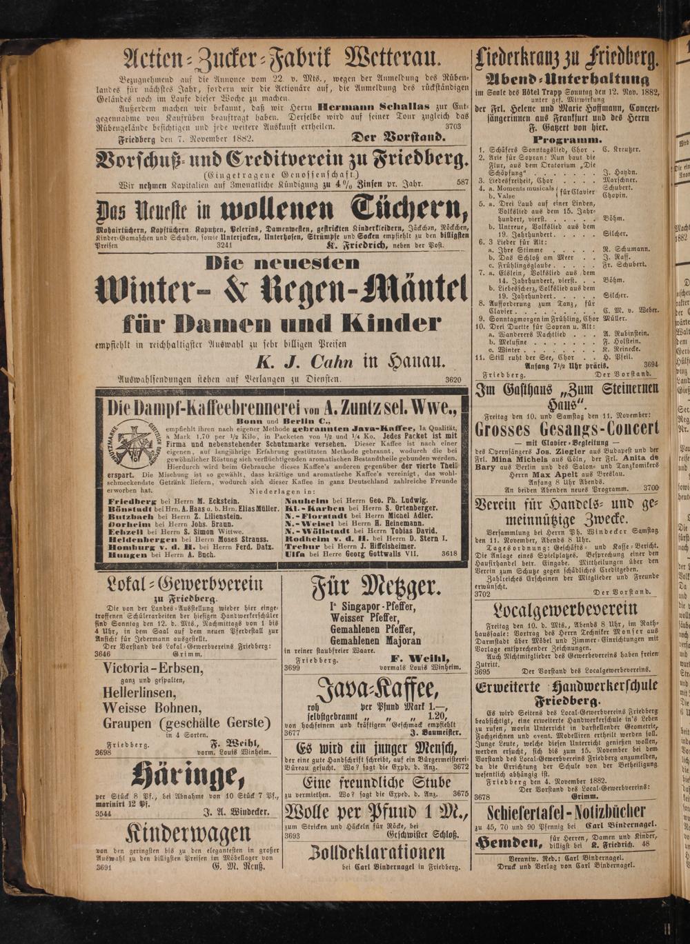 im Saale des Hötel Trapp Sountag den 12. Nov. 1882, unter gef. Mitwirkung der Frl. Helene und Marie Hoffmann, Concert⸗ sängerinnen aus Frankfurt und des Herrn F. Gatzert von hier.