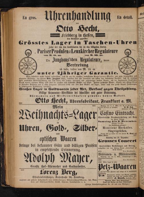 4 DUre 13 Verg, e assortirt und bringe es in empfehlende N. 1 Pelzwaaren werden von Motten gereinigt, Elfenbeinbildschnitzer, Kaiserstraße 96, Friedberg, empfiehlt als passende Festgeschenke seine selbstverfertigten Elfenbeinschmuck-Waaren, Jet, Bern⸗