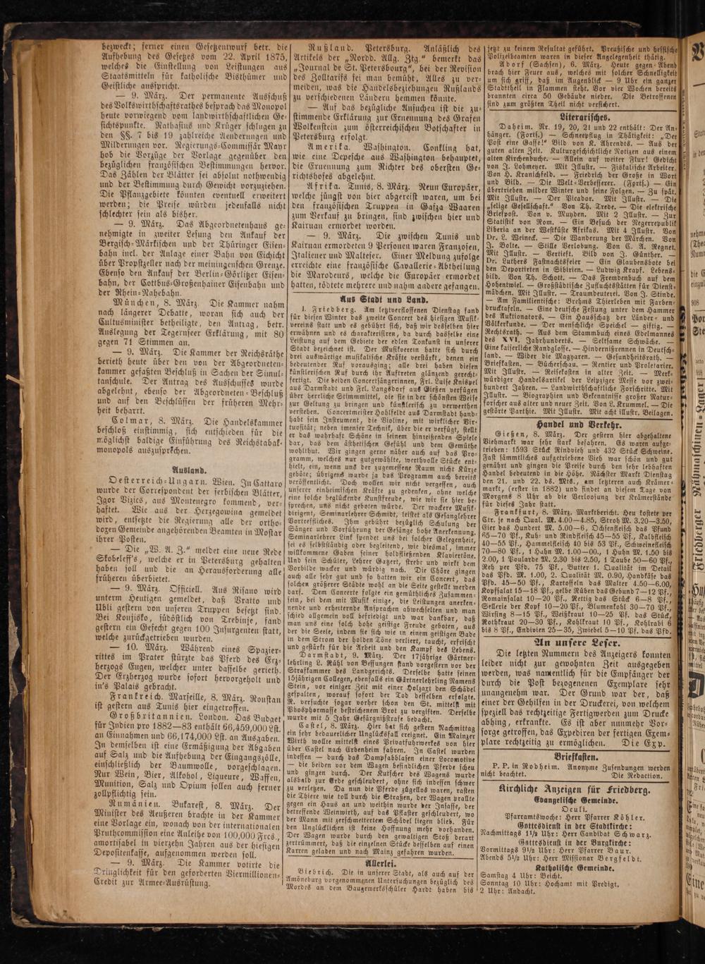 Kirchliche Anzeigen für Friedberg. Evangelische Gemeinde. O cult. Pfarramtswoche: Herr Pfarrer Köhler. Gottesdienst in der Stadtkirche: Nachmittags 1¼ Uhr: Herr Candidat Schwarz. Gottesdienst in der Burgkirche: Vormittags 9½ Uhr: Herr Pfarrer Baur. Abends 5½ Uhr: Herr Missionar Bergfeldt. statholische Gemeinde. Samstag 4 Uhr: Becht. Sonntag 10 Uhr: Hochamt mit Predigt.
