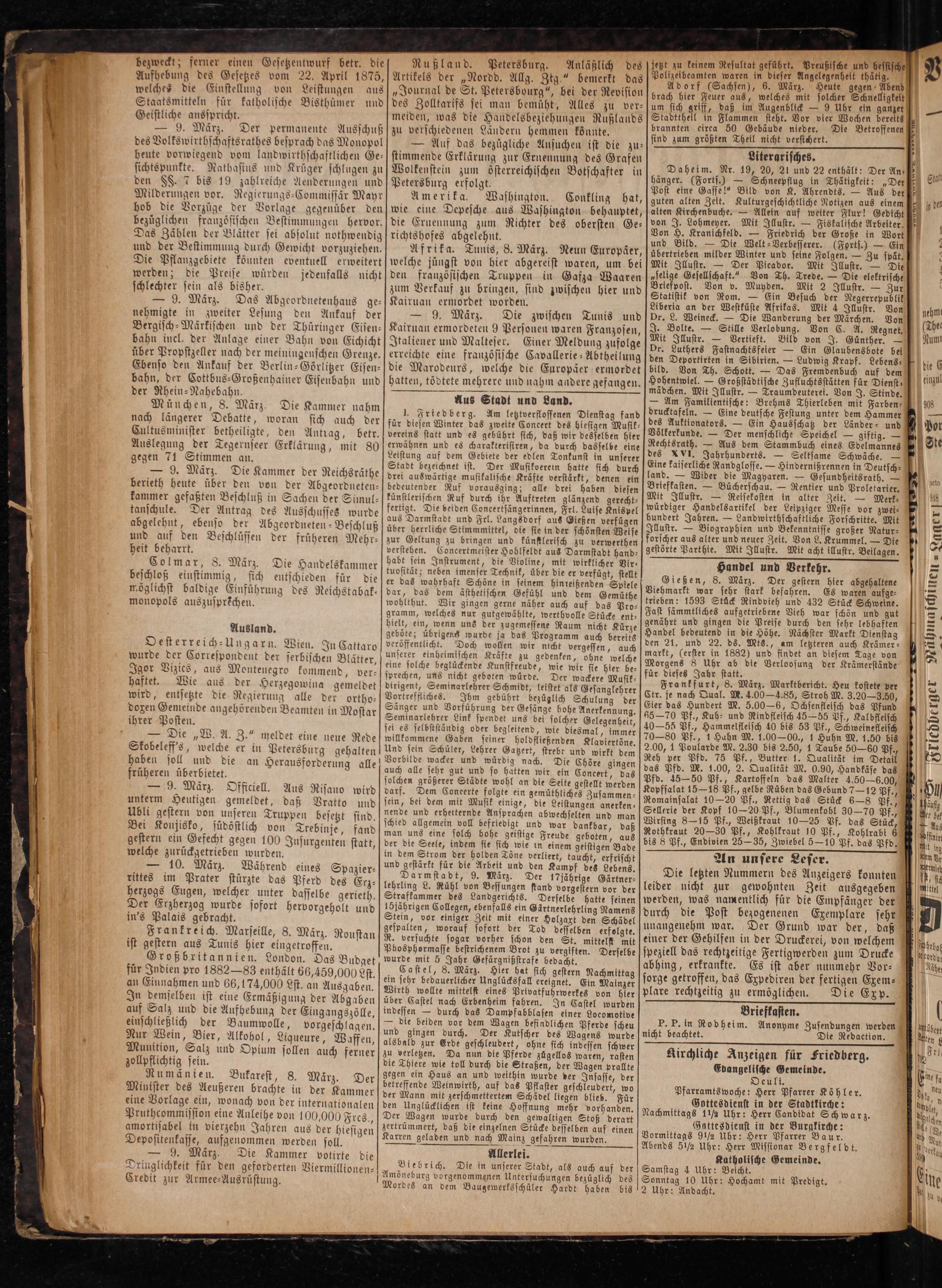 Gießen, 8. Marz. Der gestern hier abgehaltene Viehmarkt war sehr stark befahren. Es waren aufge⸗ trieben: 1593 Stück Rindvieh und 432 Stück Schweine. Fast sämmtliches aufgetriebene Vieh war schön und gut genährt und gingen die Preise durch den sehr lebhaften Handel bedeutend in die Höhe. Nächster Markt Dienstag den 21. und 22. ds. Mts., am letzteren auch Krämer⸗ markt,(erster in 1882) und findet an diesem Tage von Morgens 8 Uhr ab die Verloosung der Krämerstände für dieses Jahr statt.