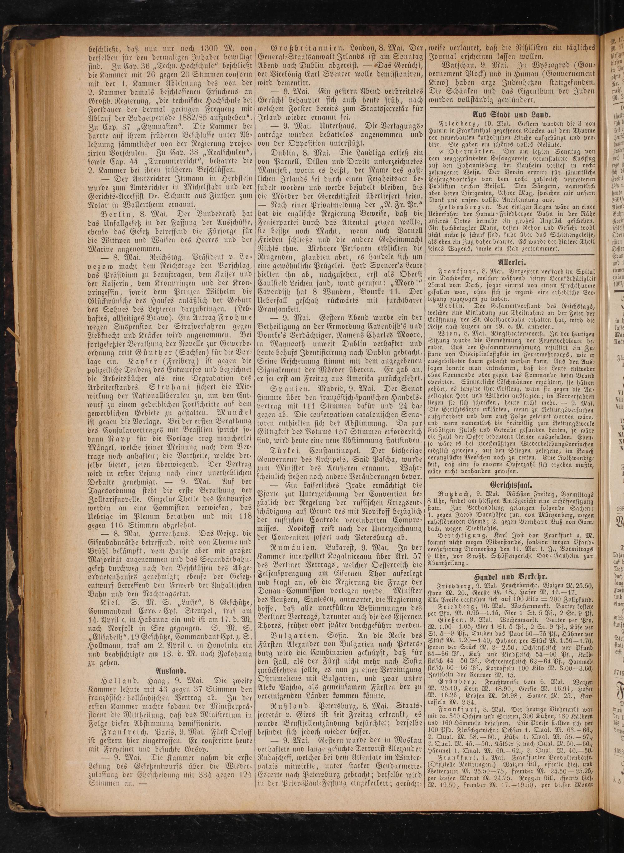 Friedberg, 9. Mal. Fruchtbericht. Waizen M. 25.50, Korn M. 20., Gerste M. 18., Hafer M. 16.— 17.