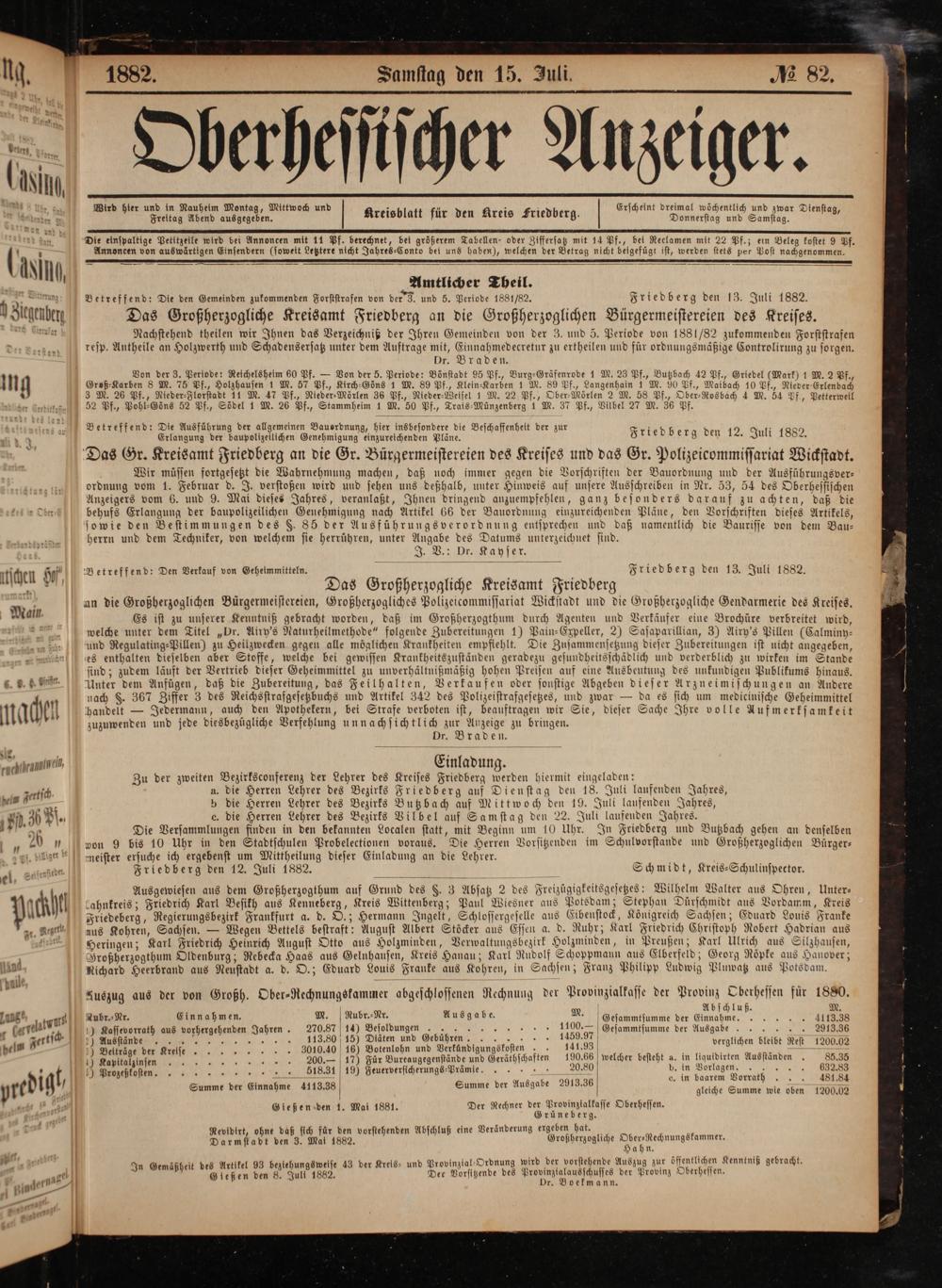 Betreffend: Den Verkauf von Geheimmitteln. Friedberg den 13. Juli 1882. Das Großherzogliche Kreisamt Friedberg