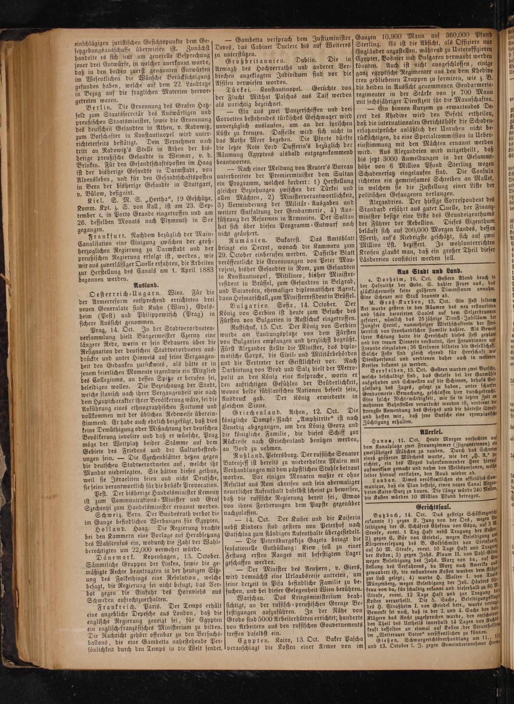 sie seien verantwortlich für die brüske Provocation. Pest. Der bisherige Handelsminister Kemeny ist zum Communications-Minister und Graf Szechenyi zum Handelsminister ernannt worden. Schweiz. Bern. Der Bundesrath verbot die im Gange befindlichen Werbungen für Egypten. Holland. Haag. Die Regierung brachte bei den Kammern eine Vorlage auf Herabsetzung des Wahlcensus ein, wodurch die Zahl der Wahl— berechtigten um 22,000 vermehrt würde. Dänemark. Kopenhagen, 13. October. Sämmtliche Gruppen der Linken, sowie die ge— f mäßigte Rechte beantragten in der heutigen Sitz⸗ ung des Folkethings eine Resolution, welche besagt, die Regierung sei nicht befugt, das Ver⸗ bot gegen die Einfuhr des Hornviehs aus Schweden aufrechtzuerhalten. Frankreich. Paris. Der Temps erhält eine angebliche Depesche aus London, daß die englische Regierung geneigt sei, für Egypten ein englisch-französisches Ministerium zu bilden. Die Nachricht gehört offenbar zu den Versuchs— ballons, die eine Gambetta nahestehende Per— ö U a sönlichkeit durch den Temps in die Welt sendet.