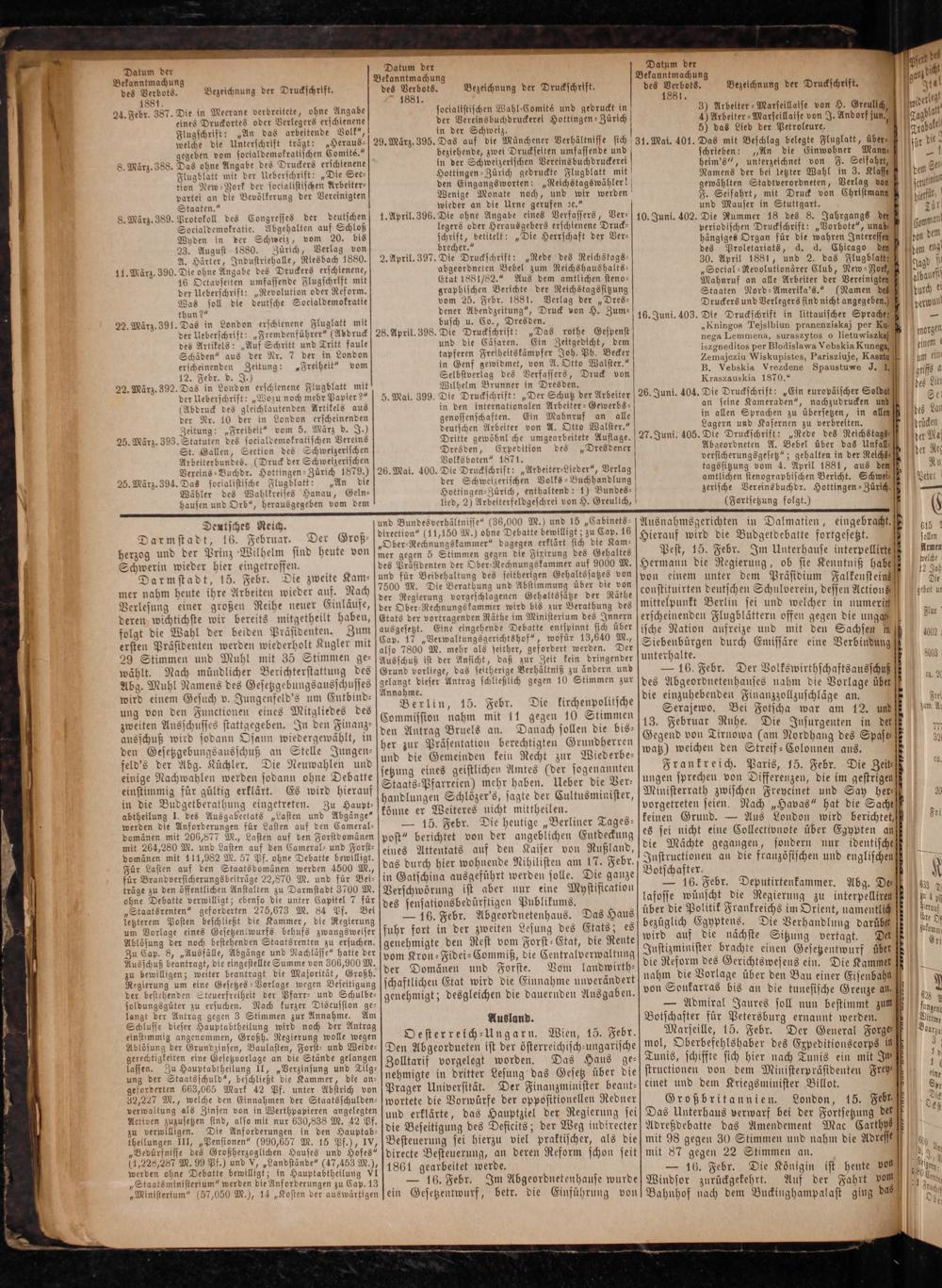 Datum der Bekanntmachung des Verbots. 1881. 24. Febr. 387. Die in Meerane verbreitete, ohne Angabe eines Druckortes oder Verlegers erschienene Flugschrift:„An das arbeitende Volk“, welche die Unterschrift trägt:„Heraus— gegeben vom soclaldemokratischen Comité.“