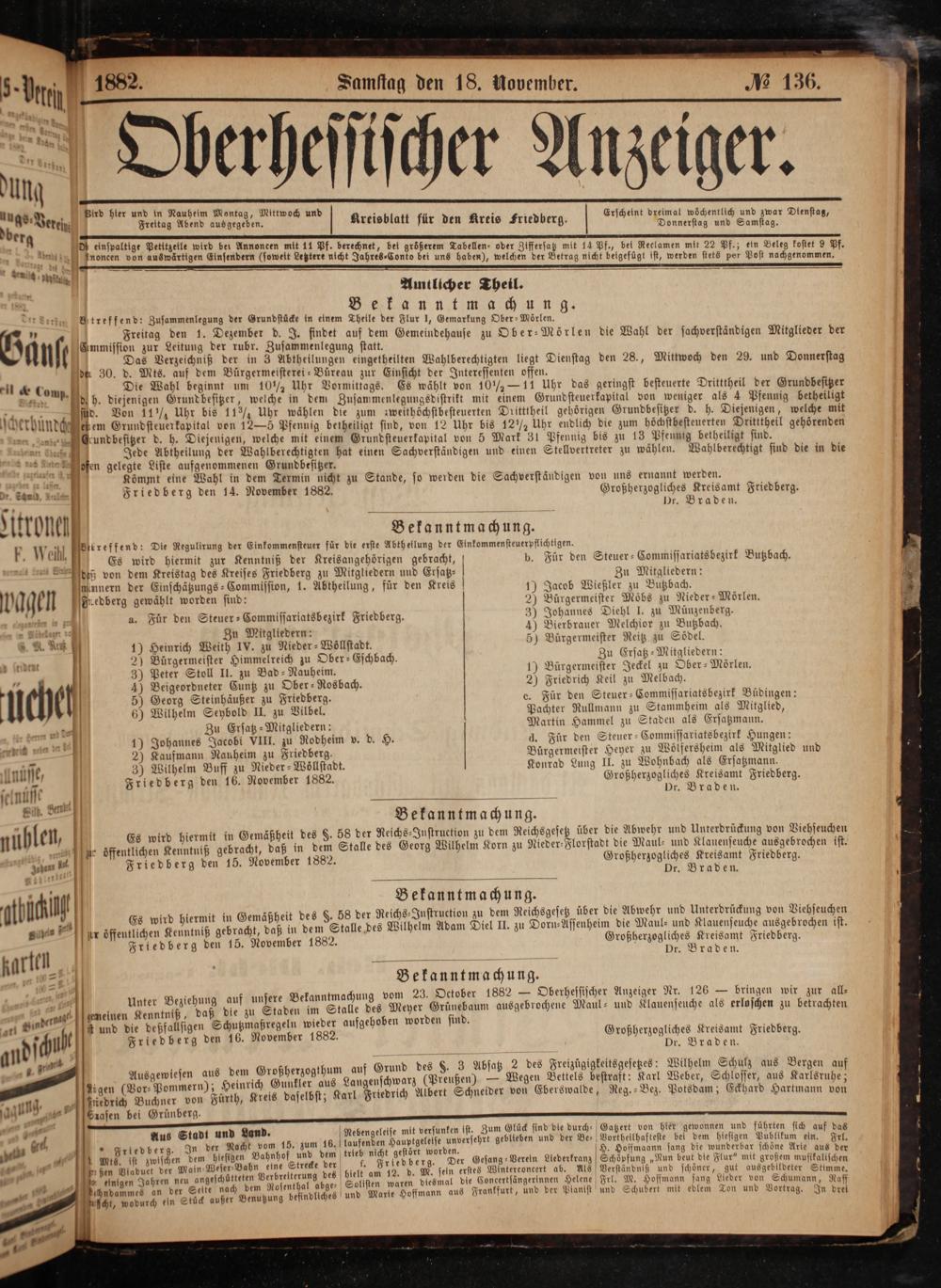 Friedberg den 14. November 1882. Großherzogliches Kreisamt Friedberg. Dr. Braden.