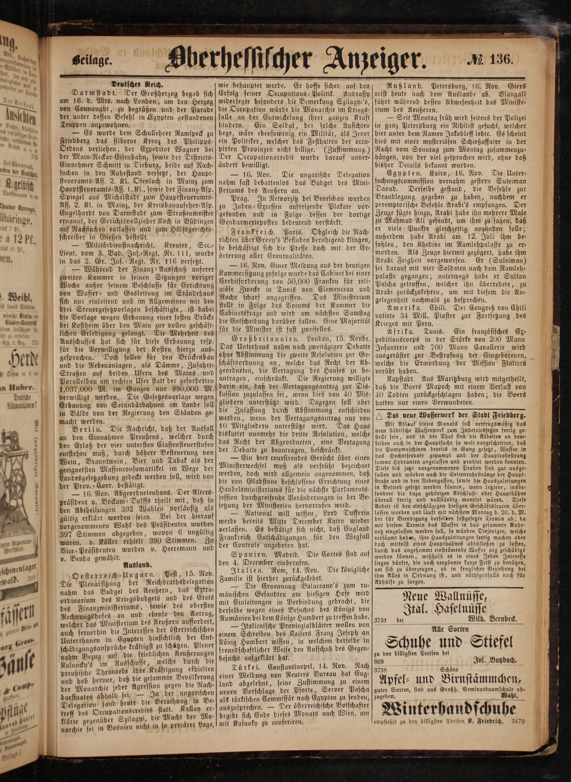 Egypten. Kairo, 16. Nov. Die Unter⸗ suchungscommission vernahm gestern Suleiman Daoud. Derselbe gestand, die Befehle zur Brandlegung gegeben zu haben, nachdem er peremptorische Befehle Arabi's empfangen. Der Zeuge fügte hinzu, Arabi habe ihn mehrere Male zu Mahmud Ali gesandt, um ihm zu sagen, daß er viele Punkte gleichzeitig anzünden solle; außerdem habe Arabi am 12. Juli ihm be— fohlen, den Khedive im Ramlehpalaste zu er— morden. Als Zeuge hiermit gezögert, habe ihm Arabi Feigheit vorgeworfen. Er(Suleiman) sei darauf mit vier Soldaten nach dem Ramleh— palaste gegangen; unterwegs habe er Sultan Pascha getroffen, welcher ihn überredete, zu Arabi zurückzukehren, um mit diesem die An— gelegenheit nochmals zu besprechen.
