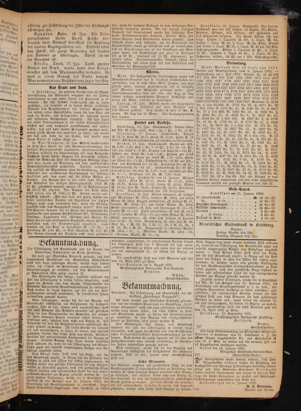 1 5 zwar in Beträgen 50 Pf., Hämmel 1. Qual. 64 Pf., 2. Qual. 50 Pf., der Kammer zu übertragen. Cherif leh ente] bis zu 90 Pf., jedesmal auf 10 Pf. abgerundet, ge- Schweine, inländ., 64 Pf. ver 1 Pfd. Schlachtgewicht., ie 9 f. en so S e ster Nebhuth schloß die ie Annahme ab. schehen sollen. Salinenrentmeister Ne 0 5 d C + i e 1 oi Versammlung mit einem Hoch auf das Aufblühen und Verloosun 0 2 b Afrika. Tunis, 17. Jan. Tajeb, zweiter 9.22 4 2 f 0 f 1 3 Bey' 5 Krieas Gedethen der Pfennigsparkasse. Stadt Mailand Lire 45⸗Loose von 1871 Bruder des Dey's wurde heute vom 5 Allerlei Serien- und Gewinnziehung vom 2. Januar 1882.— minister und dem Marineminister verhaftet. Er Aulerlei. l Heimzahlung am 1. Juli 1882. Serien: Nr. 23 44 223 wird in einem Gemach des Bardo bewacht 1—.— e n wegen des 377 425 668 970 1147 1305 1353 1372 1511— ine r 8 Ringtbeater Brandes hat so kolossale Dimensionen an⸗ 1595 1630 1647 1726 2057 2141 2144 2231 233 Man vermuthet eine Verschwörung gegen den Bey genommen, daß sie nicht schon Witte Januar, wie man 2500 2733 2836 2846 2963 3191 3211 3446 3450 3570 gehofft hatte, sondern wahrscheinlich erst in beiläufig 3625 3784 4019 4207 4287 4294 4311 4455 4507 4521 . Aus Stadt und Land. zwei Monaten zum Abschlusse gelangen wird. Zwei 4626 4702 4706 4714 4789 4807 4810 4926 5071 4552 . Friedberg. In unserem Bericht über die Abend⸗ Untersuchungsrichter sind mit dem von Tag zu Tag 5115 5554 5584 5765 5773 5876 6059 6112 6226 unterhaltung der n Gon die Instru⸗ immer riesiger anwachsenden Materlal beschaftigt und 6240 6321 6381 6487 6496 6587 6710 6722 6757 mentalpiecen in dem ersten Theile des Concertes zu er