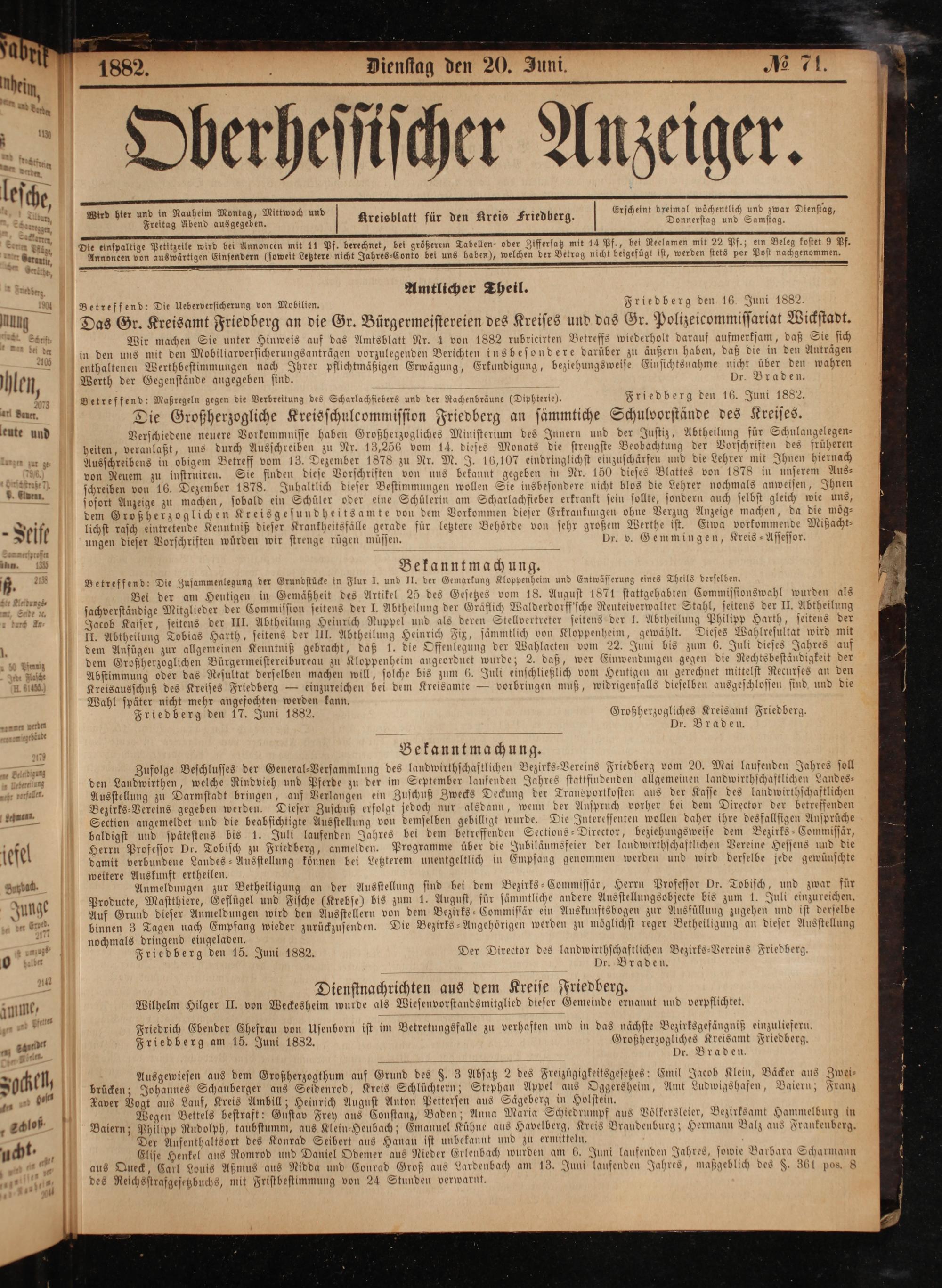 Friedberg den 15. Juni 1882. Der Director des landwirthschaftlichen Bezirks-Vereins Friedberg.