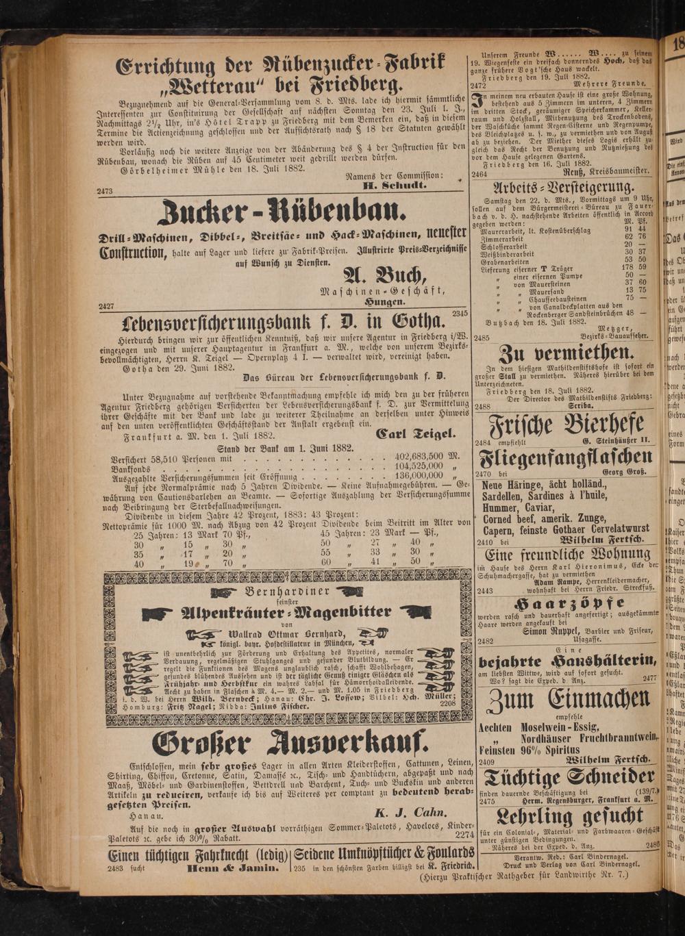 Unserem Freunde W W... zu seinem 19. Wiegenfeste ein dreifach donnerndes Hoch, daß das ganze frühere Vogt'sche Haus wackelt. Friedberg den 19. Juli 1882, 2472 Mehrere Freunde. n meinem neu erbauten Hause ist eine große Wohnung, bestehend aus 5 Zimmern im unteren, 4 Zimmern im dritten Stock, geräumiger Speicherkammer, Keller⸗ raum und Holzstall, Mitbenutzung des Trockenbodens, der Waschküche sammt Regen-Cisterne und Regenpumpe, des Bleichplatzes u. s. w., zu vermiethen und von August ab zu beziehen. Der Miether dieses Logis erhält zu⸗ gleich das Rech vor dem Hause gelegenen Gartens. Friedberg den 16. Juli 1882