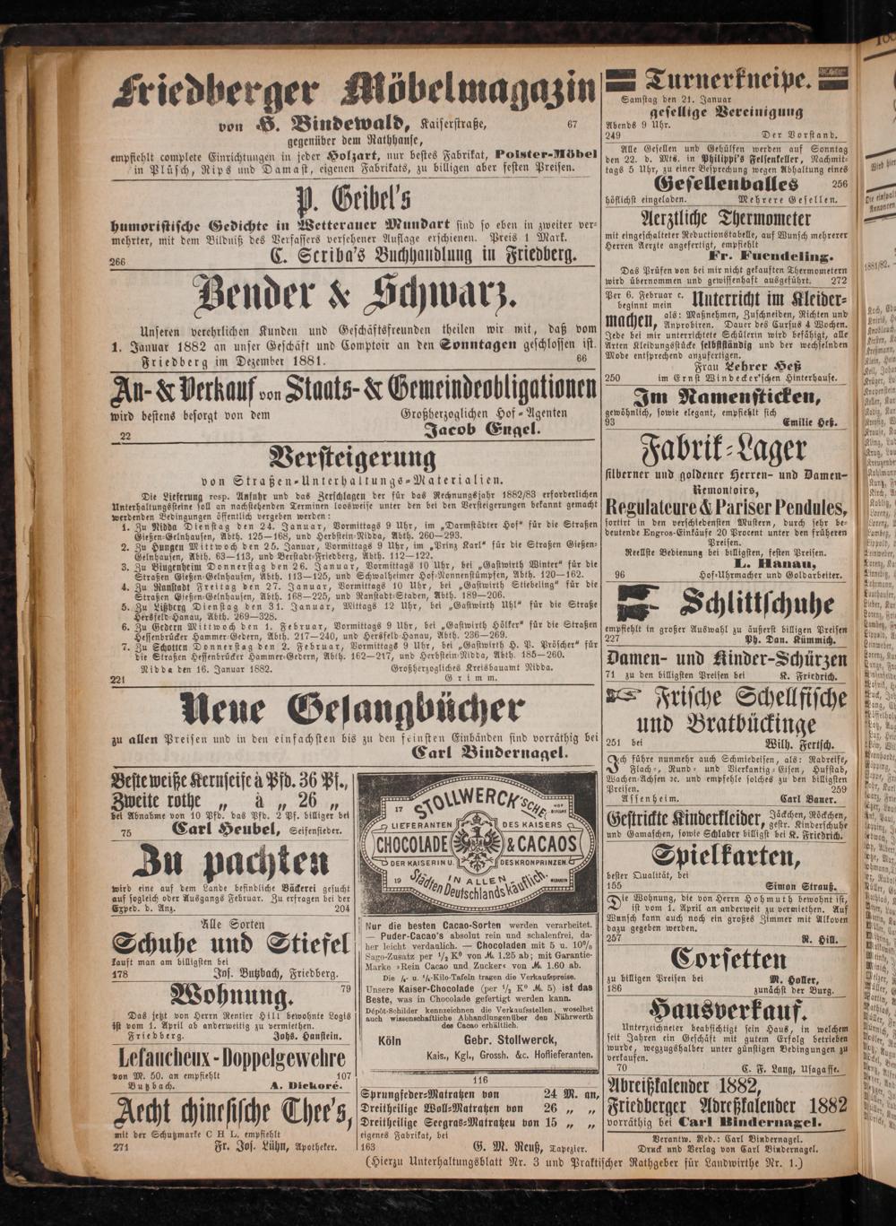 1. Januar 1882 an unser Geschäft und Comptoir an den Sonntagen geschlossen ist. Friedberg im Dezember 1881. 66