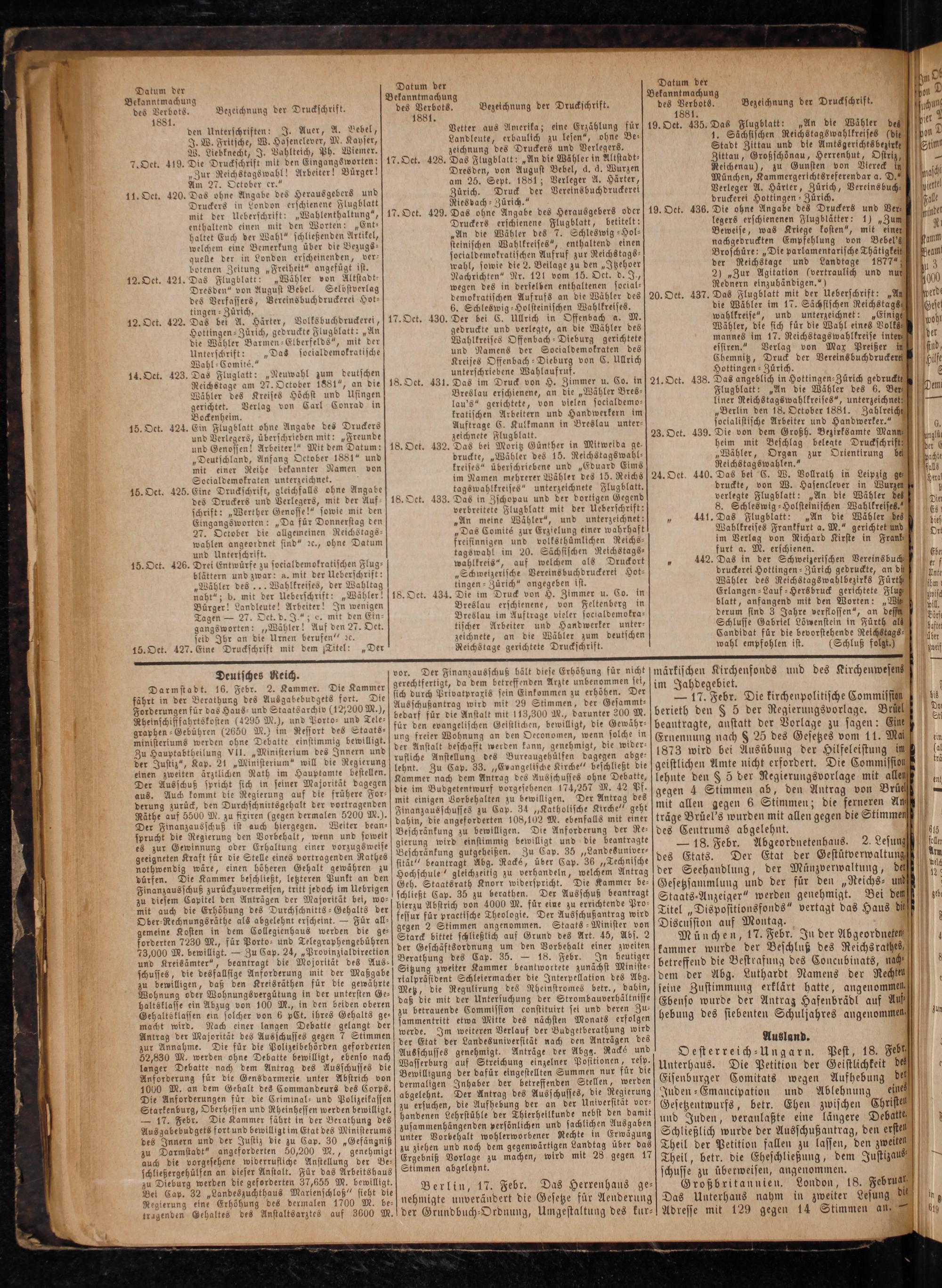 Reichstage am N. October 1881“, an die 18. Oct. 431. Das im Druck von H. Zimmer u. Co. in] 21. Oct. 438. Das angeblich in Hottingen-Zürich gedruckt Wähler des Kreises Hoͤchst und Usingen Breslau erschienene, an die„Wähler Bres— Flugblatt:„An die Wähler des 6. Ber em gerichtet. Verlag von Carl Conrad in lau's“ gerichtete, von vielen socialdemo— liner Reichstagswahlkreises“, unterzeichnet; I Bockenheim. kratischen Arbeitern und Handwerkern im„Berlin den 18. Oetober 1881. Zahlreiche 15. Oct. 424. Ein Flugblatt ohne Angabe des Druckers Auftrage C. Kulkmann in Breslau unter— soeialistische Arbeiter und Handwerker.“ 0 und Verlegers, überschrieben mit:„Freunde zeichnete Flugblatt. 23. Oct. 439. Die von dem Großh. Bezirksamte Mann ball und Genossen! Arbeiter!“ Mit dem Datum: 18. Oet. 432. Das bei Moritz Günther in Mitweida ge— heim mit Beschlag belegte Druckschrift;* „Deutschland, Anfang Oetober 1881“ und druckte,„Wähler des 15. Reichstagswahl—„Wähler, Organ zur Orientirung be achte mit einer Reihe bekannter Namen von kreises“ überschriebene und„Eduard Eims Relchstagswahlen.“ fals Socialdemokraten unterzeichnet. im Namen mehrerer Wähler des 15. Reichs] 24. Oet. 440. Das bei C. W. Vollrath in Leipzig ge⸗ I bera 15. Oct. 425. Eine Druckschrift, gleichfalls ohne Angabe tagswahlkreises“ unterzeichnete Flugblatt. druckte, von W. Hasenclever in Wurzen 9 5 des Druckers und Verlegers, mit der Auf- 18. Oct. 438. Das in Zschopau und der dortigen Gegend verlegte Flugblatt:„An die Wähler dez 9 Die schrift:„Werther Genosse!“ sowie mit den verbreitete Flugblatt mit der Ueberschrift: 8. Schleswig⸗Holsteinischen Wahlkreises.““ 68 Eingangsworten:„Da für Donnerstag den„An meine Wähler“, und unterzeichnet: 5 441. Das Flugblatt:„An die Wähler des dies 27. October die allgemeinen Reichstags„Das Comits zur Erzielung einer wahrhaft Wahlkreises Frankfurt a. M.“ gerichtet und U wahlen angeordnet sind“ ꝛc., ohne Datum freisinnigen und volksthümlichen Reichs— im Verlag von Richard Kirste in Frank und Unterschrift. tagswahl im 20. Sächsischen Reichstags⸗ furt a. M. erschienen. Ehe 15. Oct. 426. Drei Entwürfe zu socialdemokratischen Flug— wahlkreis“, auf welchem als Druckort 7 442. Das in der Schweizerischen Vereinsbuch 7 f blättern und zwar: a. mit der Ueberschrift:„Schweizerische Vereins buchdruckeret Hot— druckerei Hottingen-Zürich gedruckte, an di Unte „Wähler des... Wahlkreises, der Wahltag tingen-Zürich“ angegeben ist. Wähler des Reichstags wahlbezirks Fürth 1 naht“; b. mit der Ueberschrift:„Wähler! 18. Oct. 434. Die im Druck von H. Zimmer u. Co. in Erlangen-Lauf-Hersbruck gerichtete Flug zwisc Bürger! Landleute! Arbeiter! In wenigen Breslau erschienene, von Feltenberg in blatt, anfangend mit den Worten:„Wi ul Tagen— 27. Oet. d. J.“; e. mit den Ein Breslau im Auftrage vieler socialdemokra— derum sind 3 Jahre verflossen“, an dessi Dir gangsworten:„Wähler! Auf den 27. Oet. tischer Arbeiter und Handwerker unter— Schlusse Gabriel Löwenstein in Fürth alz hafte seid Ihr an die Urnen berufen“ zc. zeichnete, an die Wäbler zum deutschen Candidat für die bevorstehende Reichstags⸗ über 15. Oct. 427. Eine Druckschrift mit dem Titel:„Der Reichstage gerichtete Druckschrift. wahl empfohlen ist.(Schluß folgt.) m1 Deutsches Reich. vor. Der Finanzausschuß hält diese Erhöhung für nicht märkischen Kirchenfonds und des Kirchenwesenz Darmstadt. 16. Febr. 2. Kammer. Die Kammer gerechtfertigt, da dem betreffenden Arzte unbenemmen sei, im Jahdegebiet. 6 fährt in der Berathung des Ausgabebudgets fort, Die e e 8 5— 17. Febr. Die kirchenpolitische Commissigg] bs Forderungen für das Haus- und Staatsarchiv(12/200 M.), Ausschußantrag wird mit 29 Stimmen, der Gesamm beiten Rede e 1 iel Do Rheinschifffahrtskosten(4295 M.), und Porto- und Tele⸗ bedarf für die Anstalt mit 113,300 M., darunter 200 M. erieth den 8 5 der Regierungsvorlage. Brit St graphen⸗Gebühren(2650 M.) im Ressort des Staats⸗ für den euangelischen 1 bewilligt, die Gewähr⸗ beantragte, anstatt der Vorlage zu sagen: Ei ministeriums werden ohne Debatte einstimmig bewilligt. 8 3 Wohnung an den Oeronomen, wenn solche 100 Ernennung nach 8 25 des Gesetzes vom 11. Mal ein Zu Hauptabtheilung VII.„Ministerium des Innern und der Anstalt beschafft werden kann, genehmigt, die wider— 1873 wird bei Ausüb d 3 5 4 Der Justiz“, Kap. 24„Ministerium“ will die Regierung rufliche Anstellung des Bureaugehülfen dagegen abge- 182, wird bei Ausubung der Hilfeleistung im l einen zweiten arztlichen Rath im Hauptamte bestellen. lehnt. Zu Cap. 33.„Ev angelische Kirche“ beschlleßt vie geistlichen Amte nicht erfordert. Die Commissiol 1 Der Ausschuß spricht sich in seiner Majorität dagegen Nummer nach dem Antrag des Ausschusses ohne Debatte, lehnte den 8 5 der Negierungsvorlage mit allen ent aus. Auch kommt die Regierung auf die frühere For— die im Budgetentwurf vorgesehenen 174,257 1 42 Pf. gegen 4 Stimmen ab, den Antrag von Brüel— derung zurück, den Durchschnittsgehalt der vortragenden mit einigen Vorbehalten zu bewilligen. Der Antrag des it all 6 Sti 5 An Räthe auf 5500 M. zu fiöiren(gegen dermalen 5200 M.). Jinanzentsschusses zu Caß 4 zatbolscche nech ah. m eee immen; die ferneren ue Der Finanzausschuß ist auch hiergegen. Weiter vean. dahin, die angeforderten 108,102 M. ebenfalls mit einer träge Brüel's wurden mit allen gegen die Stimmen sprucht die Regierung den Vorbehalt, wenn und sowelt Beschränkung zu bewilligen. Die Anforderung der Re- des Centrums abgelehnt. 645 es zur Gewinnung oder Erhaltung einer vorzugs weise Beschrg A 75 7 00 Kae 7 7 1 7 3 9 95— 18. Febr. Abgeordnetenhaus. 2. Lesung ke . ee ee eee sitat“ beantzagt abc. Kanes aber Cap. 36„ echnische des Etats. Der Etat der Gestütverwaltuns un dürfen. Die Kammer beschließt, letzteren Punkt 1 0 Hochschule“ gleichzeitig zu verhandeln, welchem Antra