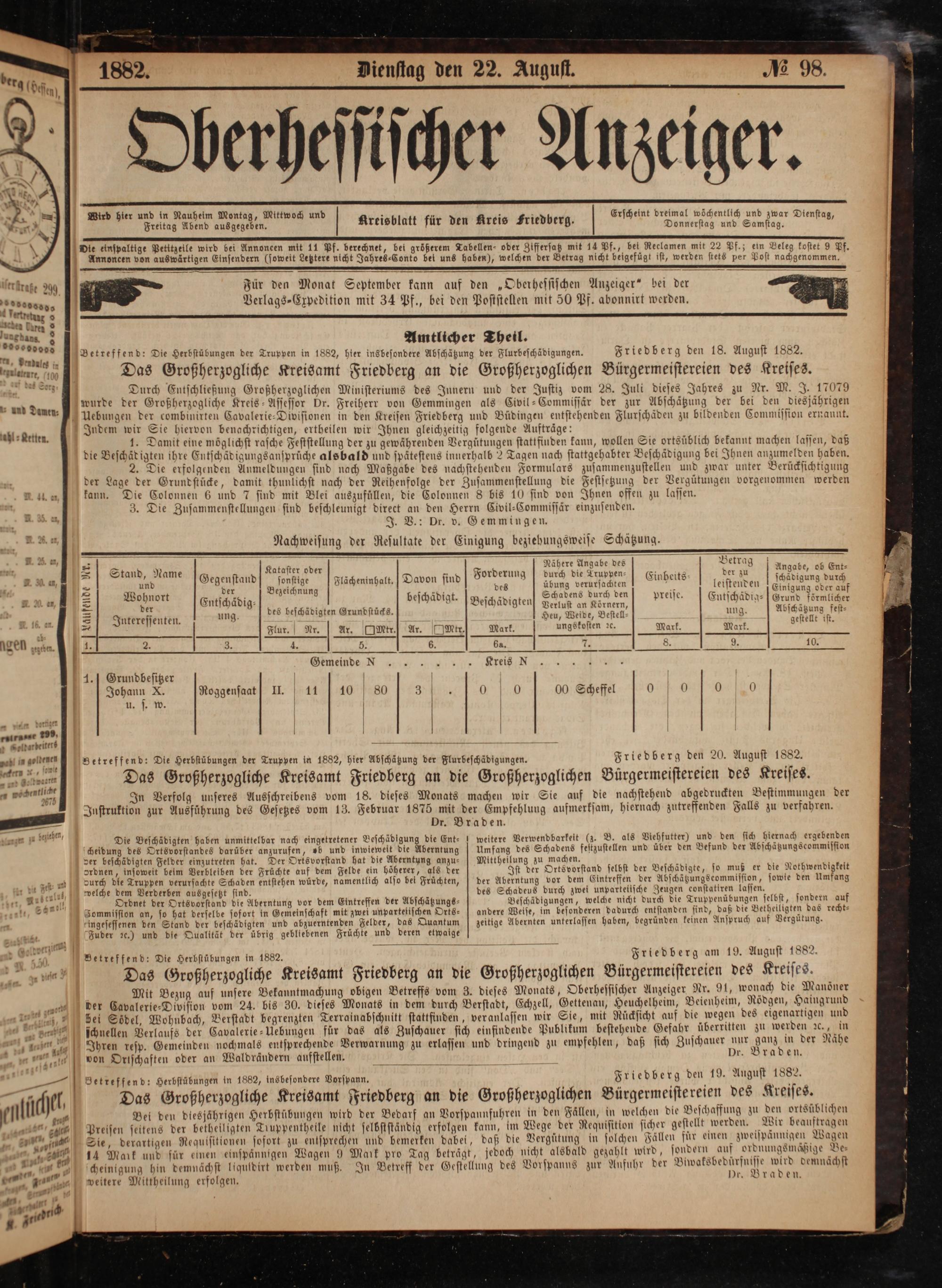 Amtlicher Theil. Betreffend: Die Herbstübungen der Truppen in 1882, hier insbesondere Abschätzung der Flurbeschädigungen. Friedberg den 18. August 1882. Das Großherzogliche Kreisamt Friedberg an die Großherzoglichen Bürgermeistereien des Kreises. Durch Entschließung Großherzoglichen Ministeriums des Innern und der Justiz vom 28. Juli dieses Jahres zu Nr. M. J. 17079 wurde der Großherzogliche Kreis-Assessor Pr. Freiherr von Gemmingen als Civil-Commissär der zur Abschatzung der bei den diesjährigen Uebungen der combinirten Cavalerie-Divisionen in den Kreisen Friedberg und Büdingen entstehenden Flurschäden zu bildenden Commission ernannt. Indem wir Sie hiervon benachrichtigen, ertheilen wir Ihnen gleichzeitig folgende Auftraͤge: 1. Damit eine möglichst rasche Feststellung der zu gewährenden Vergütungen stattfinden kann, wollen Sie ortsüblich bekannt machen lassen, daß die Beschädigten ihre Entschädigungsansprüche alsbald und spätestens innerhalb 2 Tagen nach stattgehabter Beschädigung bei Ihnen anzumelden haben. 2. Die erfolgenden Anmeldungen sind nach Maßgabe des nachstehenden Formulars zusammenzustellen und zwar unter Berücksichtigung der Lage der Grundstücke, damit thunlichst nach der Reihenfolge der Zusammenstellung die Festsetzung der Vergütungen vorgenommen werden kann. Die Colonnen 6 und 7 sind mit Blei auszufüllen, die Colonnen 8 bis 10 sind von Ihnen offen zu lassen. 3. Die Zusammenstellungen sind beschleunigt direct an den Herrn Civil-Commissär einzusenden. J. V.: Dr. v. Gemmingen.