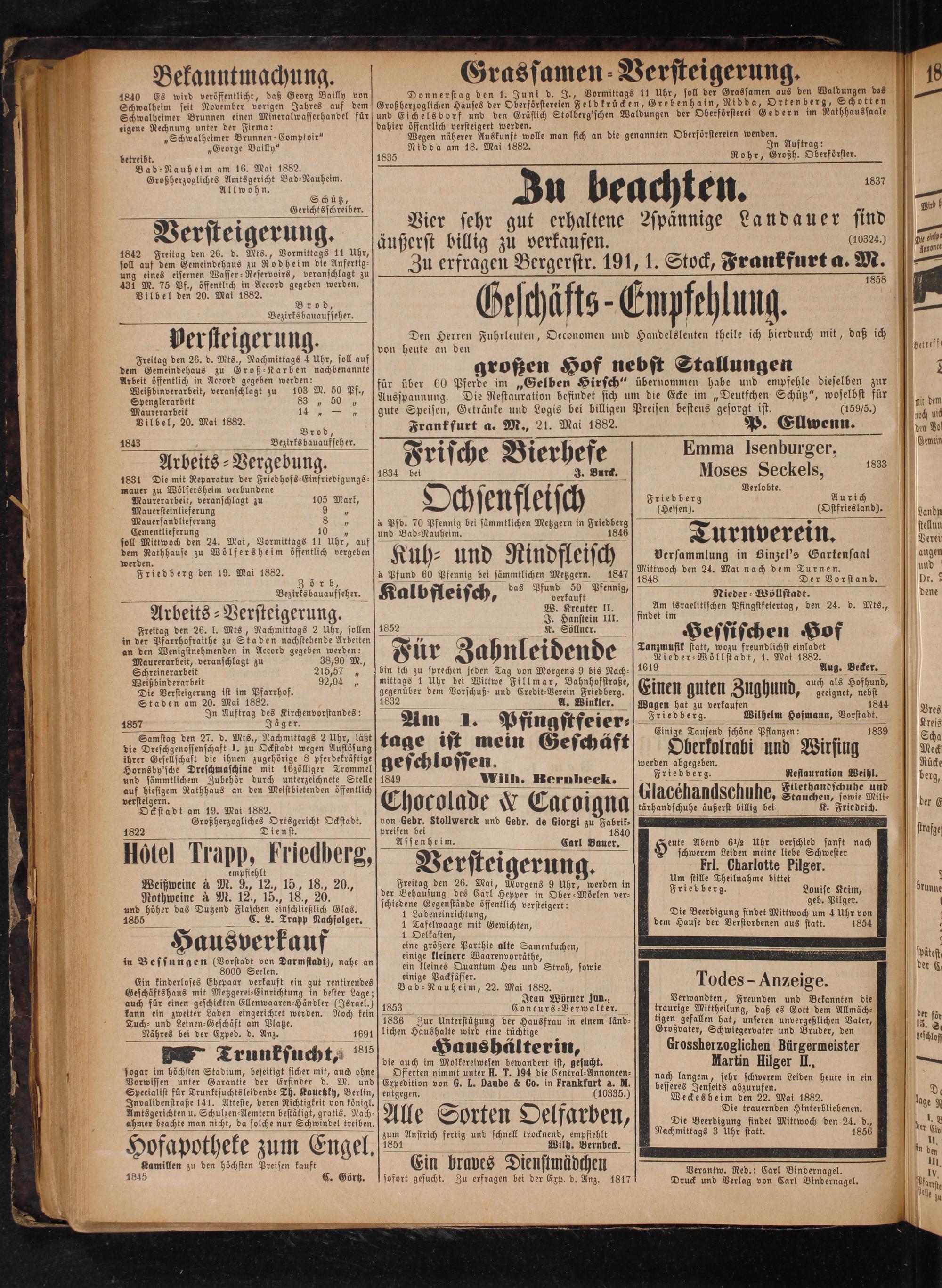 nach langem, sehr schwerem Leiden heute in ein besseres Jenseits abzurufen. Weckesheim den 22. Mai 1882. Die trauernden Hinterbliebenen. Die Beerdigung findet Mittwoch den 24. d., Nachmittags 3 Uhr statt. 1856