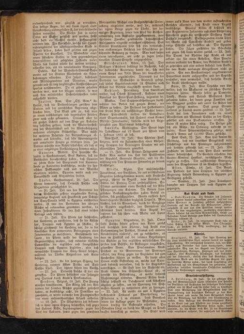 Egypten. Alexandrien, 21. Juli. Omar Lufti Pascha kehrte gestern von Kairo zurück und berichtete dem Khedive, daß Arabi eine Versammlung der Paschas, Ulemas und anderer Notabilitäten einberief, um zu entscheiden, ob man im Hinblick auf die intimen Beziehungen des Khedive zu den englischen militärischen Be— hörden dem Befehle, die Rüstungen einzustellen, gehorchen könne. Eine Proclamation Arabi Paschas an die Gouverneure der Provinzen erklärt, den Krieg gegen die Engländer bis zum Aeußersten führen zu wollen. Er droht allen Denen ernste Bestrafung an, welche das Vater— land dadurch verrathen, daß sie die Engländer unterstützen.— Es läuft hier die Nachricht ein, Arabi dämme den Süßwasser-Canal ab; es herrscht die Befürchtung, es werde dadurch Wassermangel eintreten. General Alison beab⸗ sichtigt deßhalb ein Detachement nach Achaflano abgehen zu lassen, um die Sperrung des Süß⸗ wasser⸗Canals zu verhindern oder zu sprengen. — 22. Juli. Es wurde ein aus 4 Egyptern bestehendes Tribunal zur Aburtheilung der Plünderer u. s. w. ernannt. Lord Beresford leitete die Anklage gegen die Missethäter, von denen dreißig die Bastonade erhielten. Die Situation fängt an durch den Mangel an Trink—