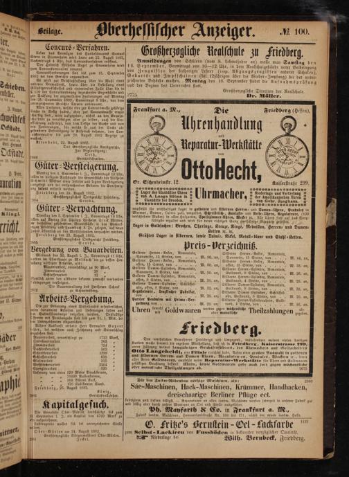Den verehrlichen Bewohnern Frledbergs und Umgegend, insbesondere meinen vielen dortigen Kunden mache hlermit die ergebene Mittheilung, daß ich in Friedberg, Kaiserstrasse 299, unter Führung meines langjährigen Geschäftsführers, des Uhrmachers und Goldarbeiters Otto Langeheldt, eine Fillale errichtet habe. Außer einer großen Auswahl in goldenen und silbernen Herren- und Damen Uhren, Negulatenren, Pendules, Weckern ꝛc., sowie