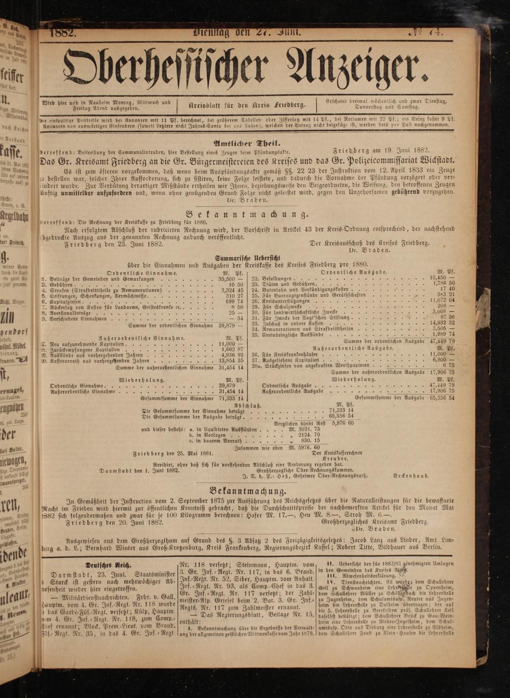 1 Nach erfolgtem Abschluß der rubricirten Rechnung wird, der Vorschrift in Artikel 43 der Kreis-Ordnung entsprechend, der nachstehend bgedruckte Auszug aus der genannten Rechnung andurch veröffentlicht. Friedberg den 23. Juni 1882.