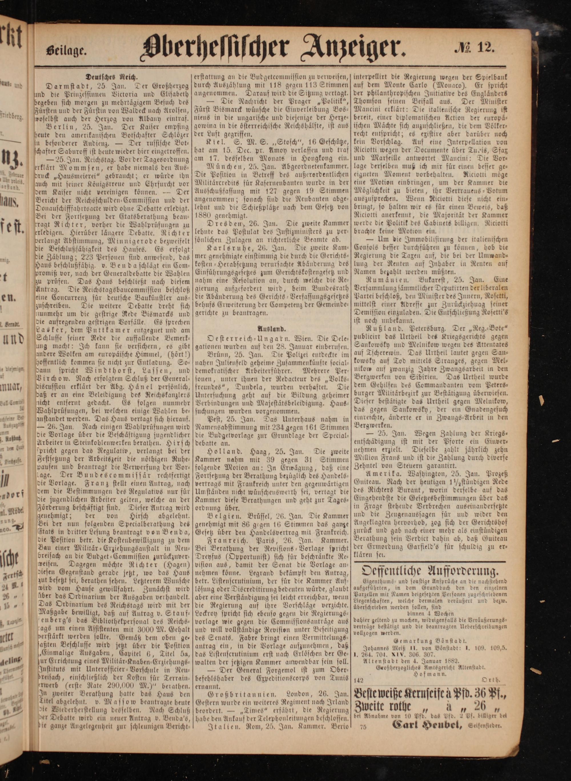 Bemerk— es gibt (hört!) nicht zur Entladung. So— dann spricht Windthorst, Lassen, und Virchow. Nach erfolgtem Schluß der General discussion erklärt der Abg. Hänel persönlich, daß er an eine Beleidigung des Reichskanzlers ncht entfernt gedacht. Es folgen nunmehr Wahlprüfungen, bei welchen einige Wahlen be— anstandet werden. Das Haus vertagt sich hierauf. — 26. Jan. Nach einigen Wahlprüfungen wird die Vorlage über die Beschäftigung jugendlicher Arbeiter in Steinkohlenwerken berathen. Hirsch spricht gegen das Regulativ, verlangt bei der Jestsetzung der Arbeitszeit die nöthigen Ruhe— pausen und beantragt die Verwerfung der Vor— gage. Der Bundescommissär rechtfertigt die Vorlage. Franz stellt einen Antrag, nach dem die Bestimmungen des Regulativs nur für die jugendlichen Arbeiter gelten, welche an der Förderung beschäftigt sind. Dieser Antrag wird genehmigt; der von Hirsch abgelehnt. Bei der nun folgenden Specialberathung des Etats in dritter Lesung beantragt von Benda, die Position betr. die Kostenbewilligung zu dem Bau einer Militar-Erziehungsaustalt in Neu— breisach an die Budget-Commission zurückzuver— weisen. Dagegen moͤchte Richter(Hagen) diesen Gegenstand gerade jetzt, wo das Haus zut besetzt sei, berathen sehen. Letzterem Wunsche vird vom Hause gewillfahrt. Zunächst wird über das Ordinarium der Ausgaben verhandelt. Das Ordinarium des Reichstags wird mit der Maßgabe bewilligt, daß auf Antrag v. Stauf— enberg's das Bibliothekpersonal des Reichs— ags um einen Assistenten mit 3000 M. Gehalt verstärkt werden sollte.